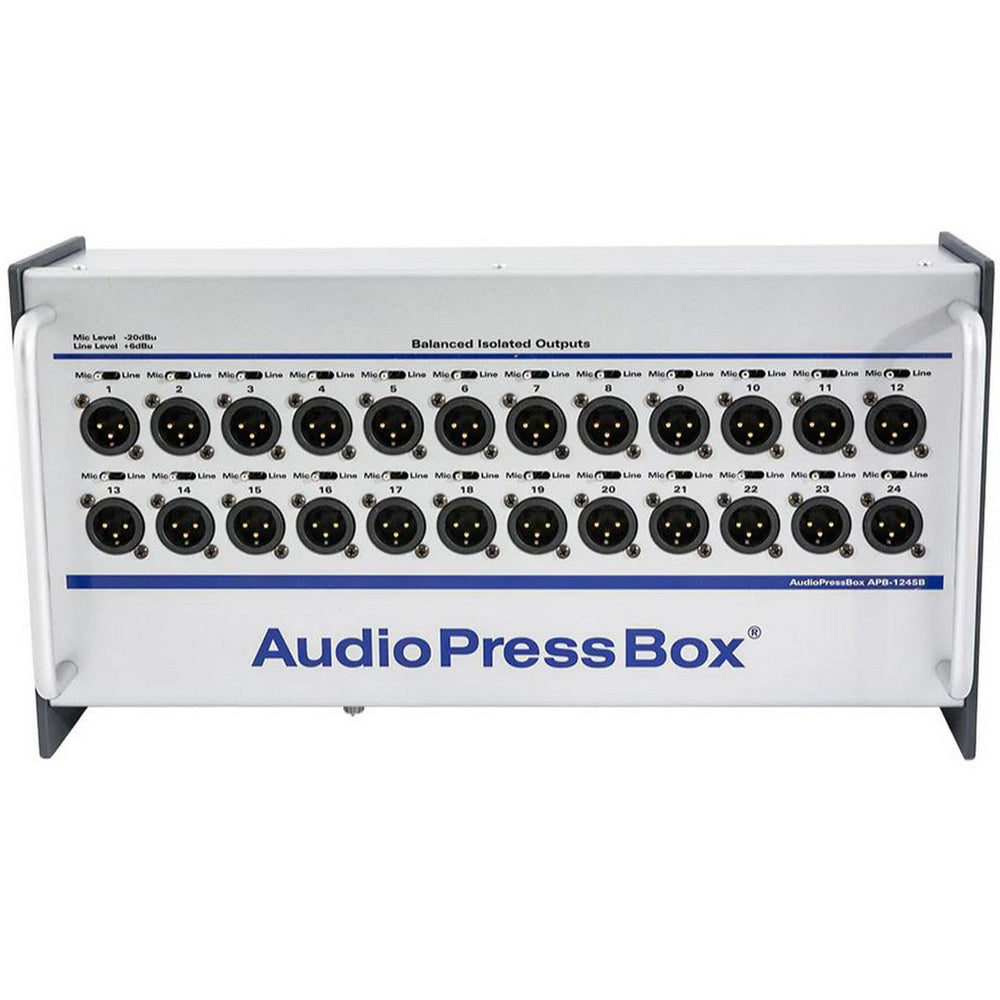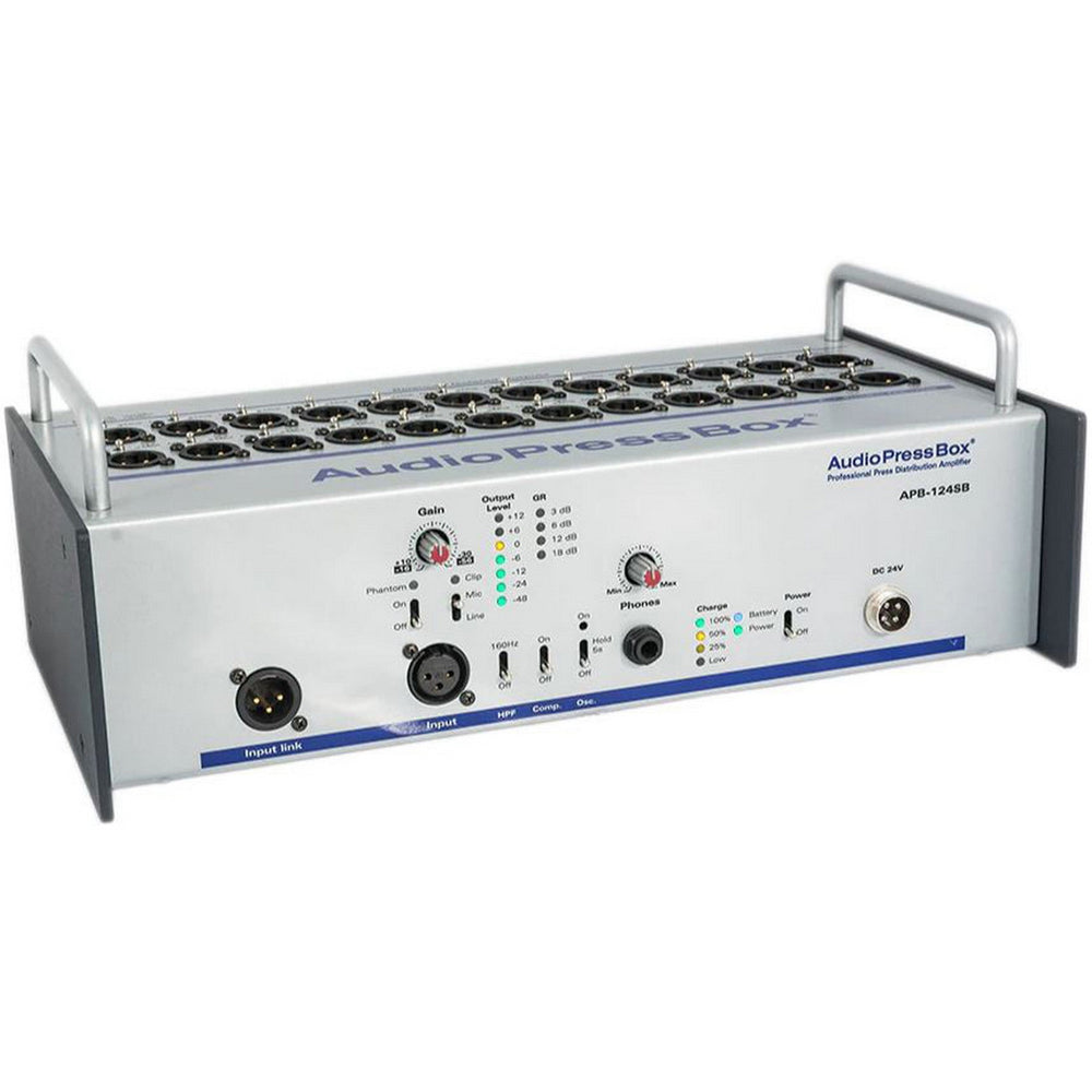 The APB-124 SB is a professional portable active press box (Audio Splitter) suitable for both indoor and outdoor press conferences. It features 1 MIC/Line Input and 24 Line/Mic Outputs. Each Output is independently transformer balanced and isolated. The APB-124 SB also includes a rechargeable AccuPack Battery so it can run on its own up to 8 hours and a link Output so you can daisy chain more if you need additional Line/MIC Outputs.