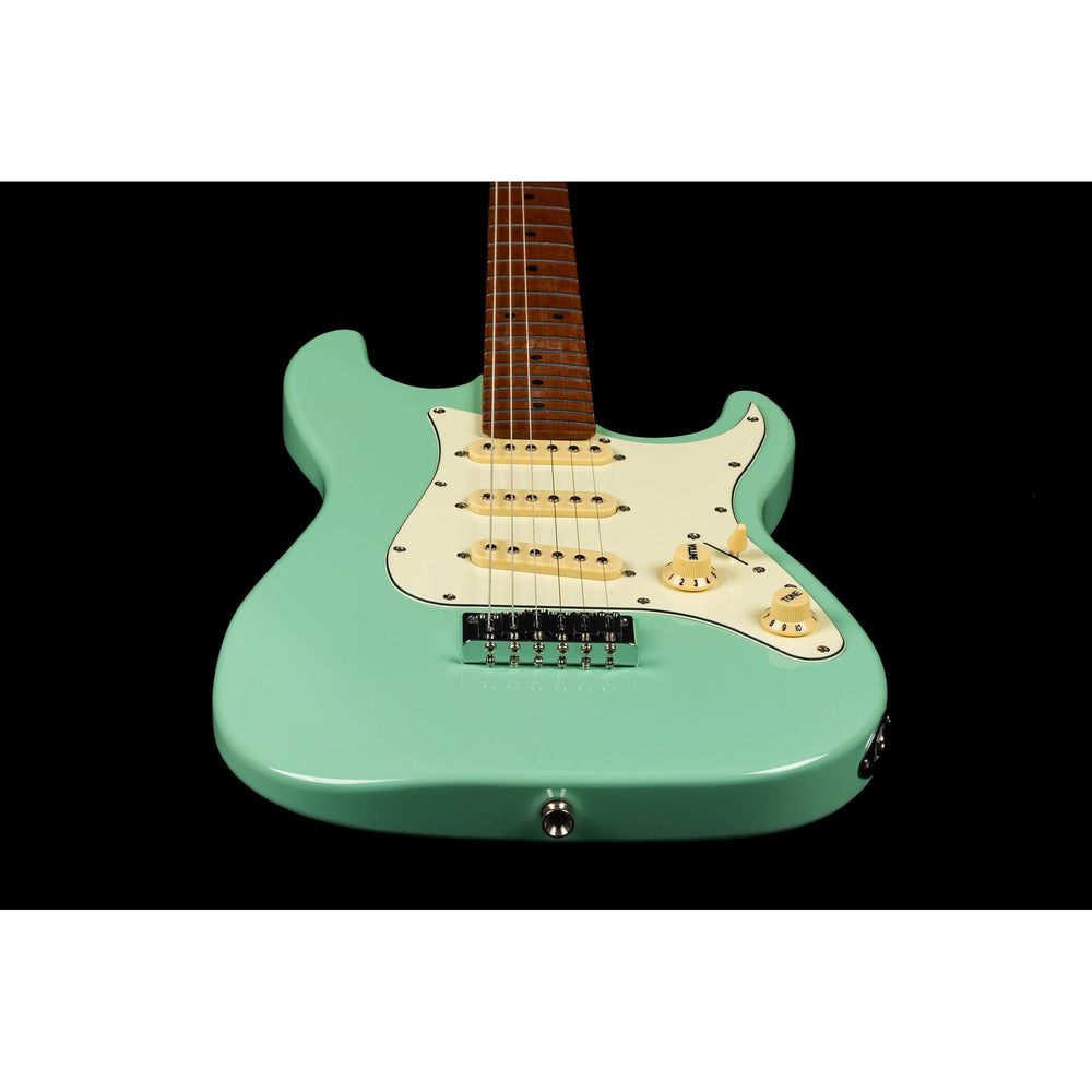 The JET JS-300 MINI SFG is a compact electric guitar that delivers full-size functionality in a travel-friendly body. With its roasted poplar construction, roasted maple neck, and ceramic SSS pickup configuration, it provides clarity, versatility, and modern tone in Sea Green finish.