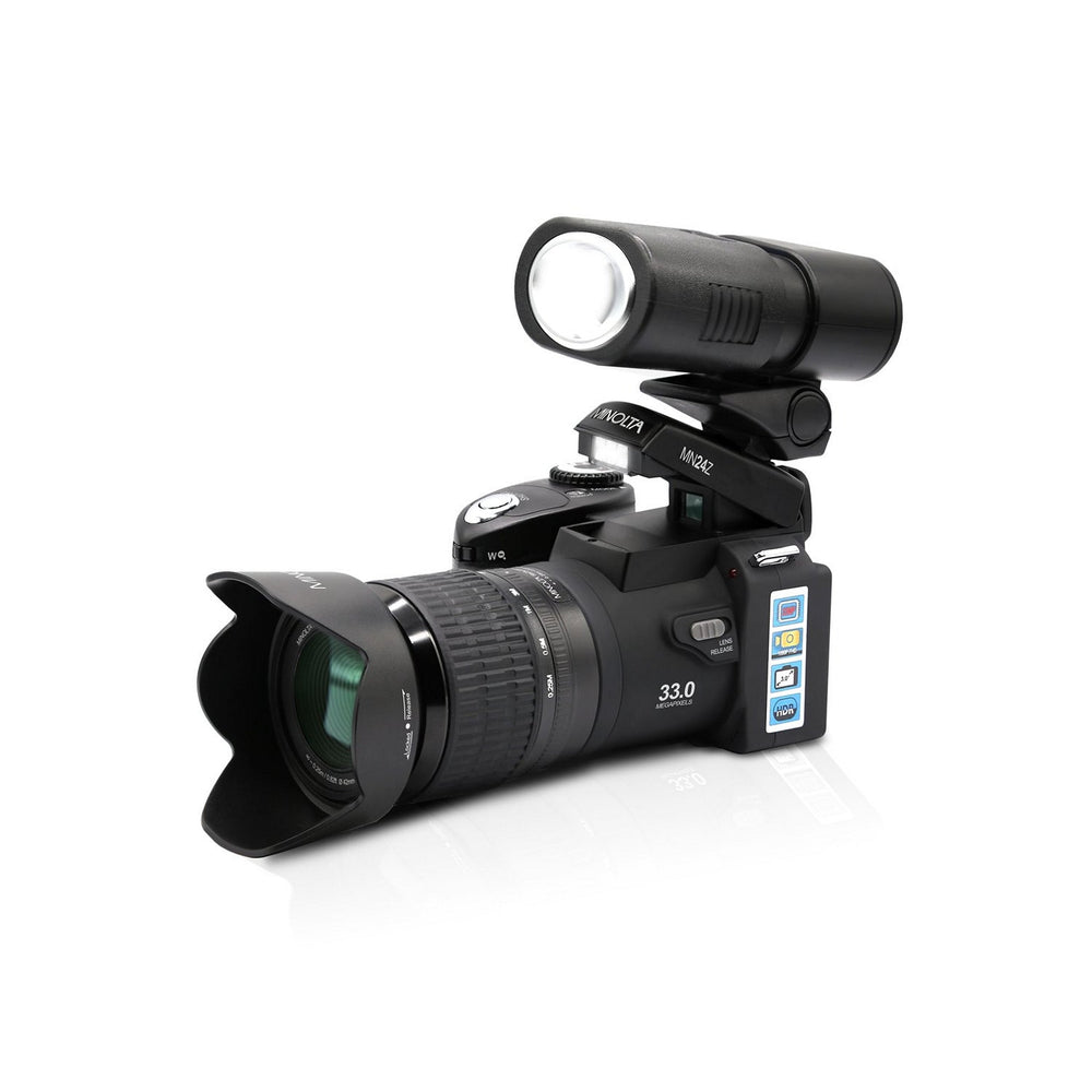 The MN24Z Digital Camera shoots 33MP pictures and 1080p Full HD video. Featuring a compact size, 8X digital zoom lens, 3.0” LCD and intelligent scene modes make shooting the perfect shot easy. Swap out the standard lens with the included 24X telephoto lens or the included wide-angle lens to capture the perfect shot in any setting. Included Accessories: Standard Lens, 0.5x Wide-Angle Lens, 16x-24x Tele Zoom Lens, LED Spotlight, Remote Control, Lithium-Ion Battery, Battery Charger, AC Adaptor, Neck Strap, Lens Cap, 32GB Memory Card, 52” Tripod, USB Cable, A/V Cable, Instruction Manual, Carrying Bag.