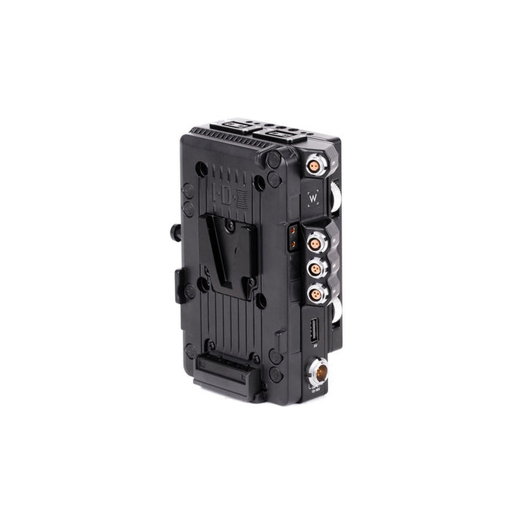 The Wooden Camera D-Box mounts between your V-Mount battery and RED® DSMC2™ camera (Weapon, Epic-W, Scarlet-W, Raven, etc.), providing tool-less installation and power distribution with hot-swap capability. It keeps you powered during battery swaps and adds extra accessory outputs without cable clutter, thanks to its Cable-less interface and contoured connectors.