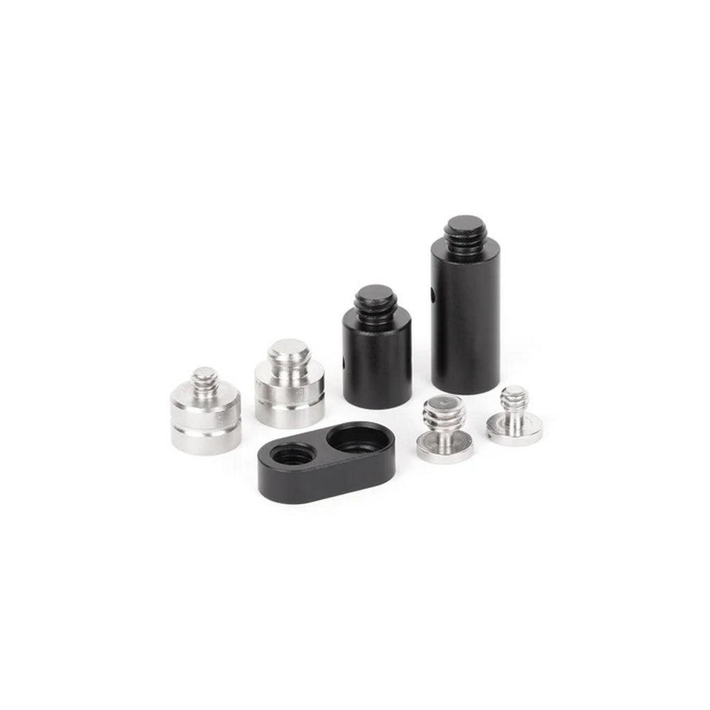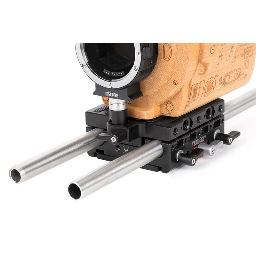 This kit attaches securely to the vertical 15 mm rod port located on Wooden Camera’s Unified Baseplate upper dovetail plate. Designed to support lens adapters—such as Metabones—with bottom ¼-20 or ⅜-16 mounting feet, it strengthens the connection between the adapter and the camera body for enhanced stability.
