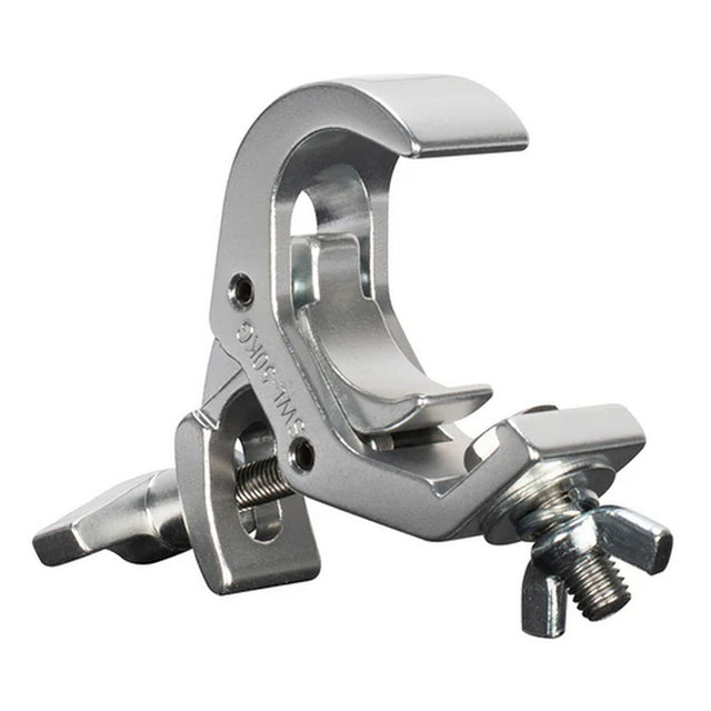 The JR Quick Rig Clamp is a medium-duty hook-style clamp designed for fast and secure mounting of lighting fixtures to F23 and F24 truss systems. It features a T-handle for tool-free operation and is compact for convenient handling.