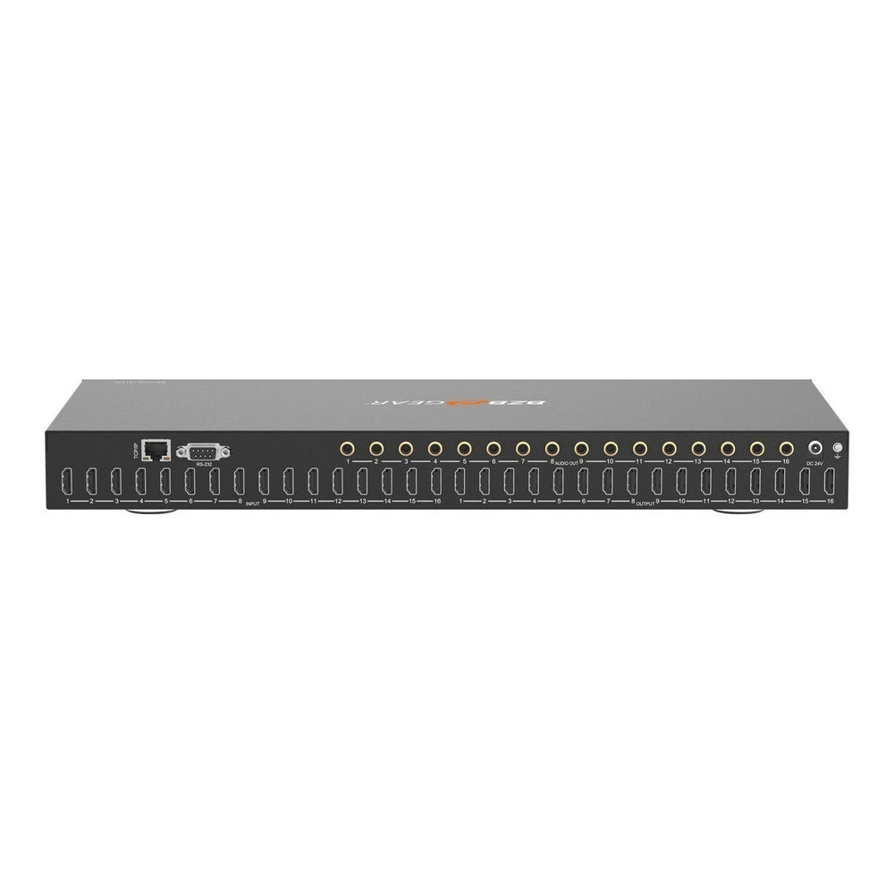 The BG-UHD-1616M is a 4K HDMI matrix switcher which supports video and audio from up to 16 sources to up to 16 HDMI displays. With this matrix, users can switch which display uses which input, enabling a great deal of control over many displays at once. Connectivity This matrix supports HDMI 2.0b and HDCP 2.2/1.x. The BG-UHD-1616M supports resolutions as high as 4K2K@60Hz (YUV 4:4:4) on all HDMI ports, ensuring a clear picture if using high quality inputs. All video outputs are capable of downscaling 4K video to 1080p if necessary and this matrix has a maximum video bandwidth of 18Gbps. Put together, these features ensure the delivery of pristine uncompressed video transmission to up to 16 displays. Features & Control The BG-UHD-1616M supports HDMI audio pass-through up to 7.1 CH HD audio (LPCM, Dolby TrueHD, and DTS-HD Master Audio). Audio can be extracted via corresponding digital coax ports for each HDMI output. This provides additional functionality for operators looking to send audio to external devices to individual zones. Operators have numerous options for controlling this HDMI matrix. To switch which input is shown on a display, operators can use front panel buttons, an IR remote, RS-232, IP commands, or the web interface. ARC, CEC, and smart EDID management are supported. The BG-UHD-1616M has 21 factory-defined EDID settings, as well as two user-defined EDID modes. There are also 16 copy EDID modes. This enables operators to tailor their control experience to their particular use case.