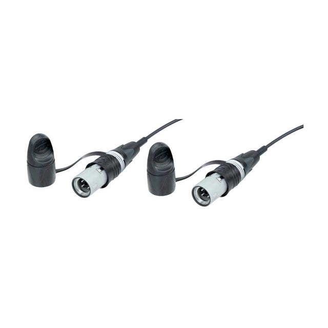 Featuring IP65 rated mating for dust and water when connected, this cable uses bend insensitive single mode fiber with aramid yarn strength members for protection. The push pull locking connectors are rugged yet easy to operate, equipped with rubber caps for extra protection, and compatible with standard opticalCON QUAD connections.