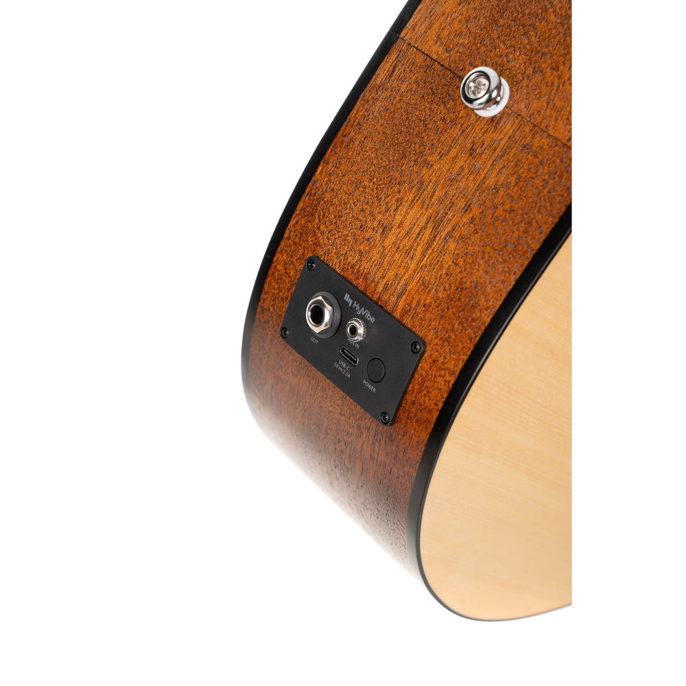 Equipped with HyVibe 2 electronics, this guitar offers smart features that expand its usability. Whether through amplification or Bluetooth speaker connection, it adapts seamlessly for performance and practice. The open pore natural finish showcases the wood grain and gives the instrument a refined, organic aesthetic.