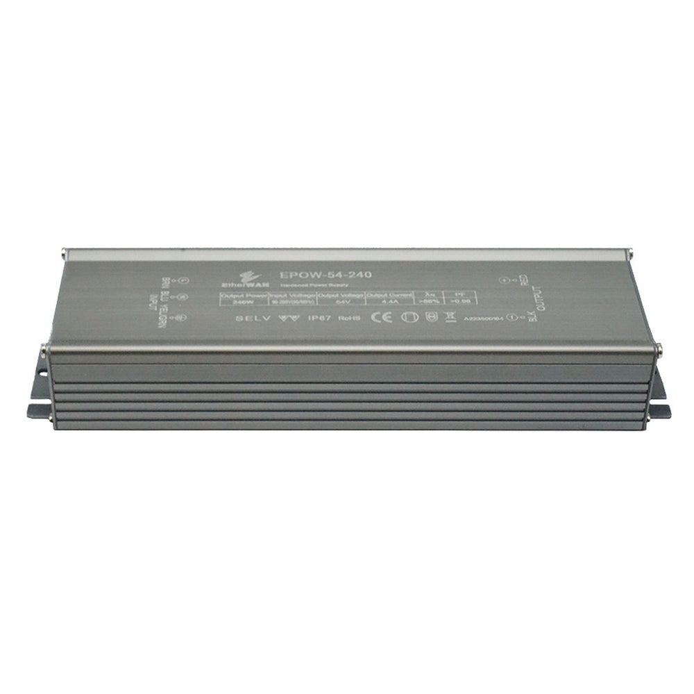 With a wide operating temperature range of -40 to 75°C (-40 to 167°F) and built with an aluminum fanless design, EtherWAN’s EPOW-54-240 is a 54V 240W hardened power supply designed to operate in the most extreme environments. The EPOW-54-240 has a 240W power budget and built-in over-voltage and short-current protection, making it a perfect and reliable solution for PoE applications.
