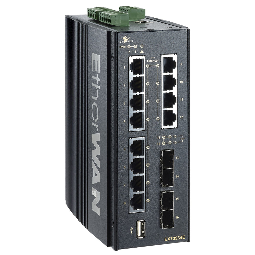 EtherWAN's EX73900E series is a hardened DIN-rail mounted managed Ethernet switch platform. Equipped with up to 12 gigabit Ethernet and 4 dual-rate gigabit SFP ports, the EX73900E series provides flexibility, speed, and reliability to support networks for urban infrastructure, transportation, security, power substations, and other areas where connectivity is crucial.