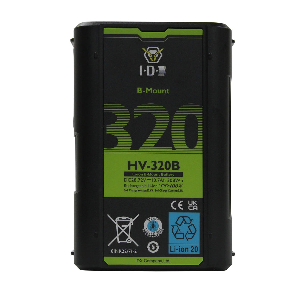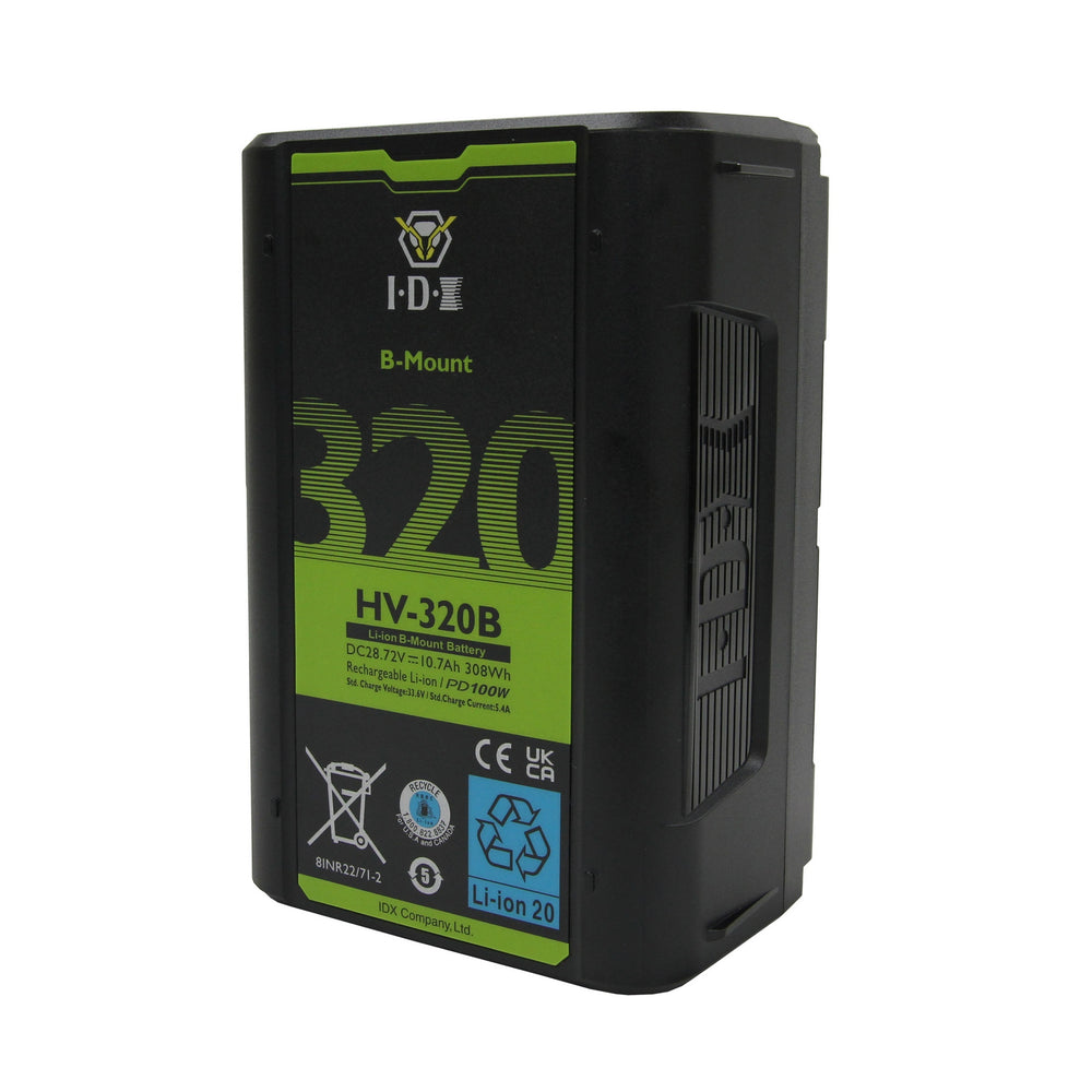 The IDX HV-320B is a powerful 28.8V Li-Ion battery designed for professional video equipment requiring extended runtime. With a substantial 307Wh capacity, this B-Mount battery supports cameras, lights, and other accessories, ensuring reliable and long-lasting power for demanding shoots and workflows.