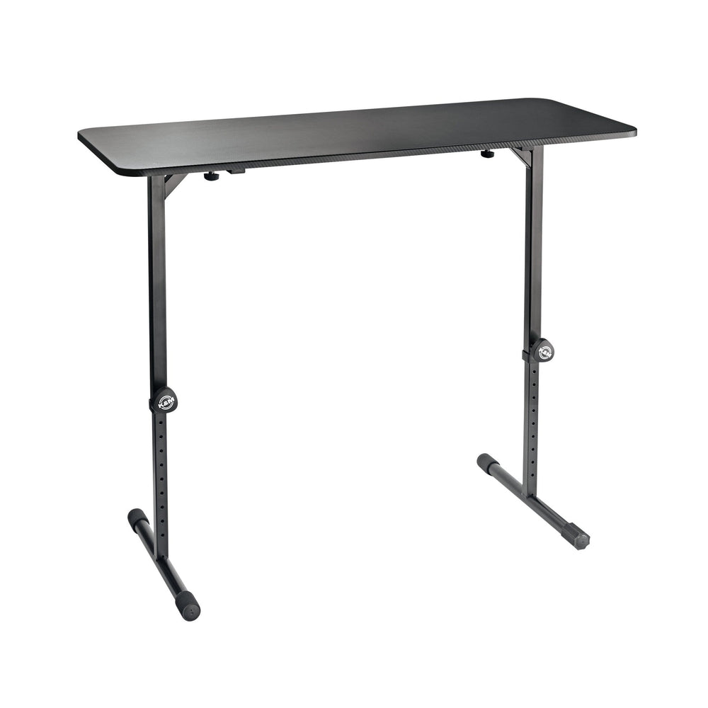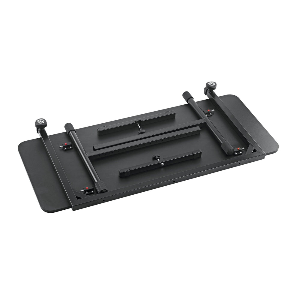 Constructed with a sturdy steel tube frame, this desk ensures the necessary support for your equipment. The tabletop, made from high-quality MDF, can be swiftly mounted or removed thanks to four quick-release clamps, facilitating easy setup and teardown. Additionally, the desk features an adjustable end cap that guarantees a wobble-free stand, even on uneven surfaces, ensuring your gear remains secure during use.