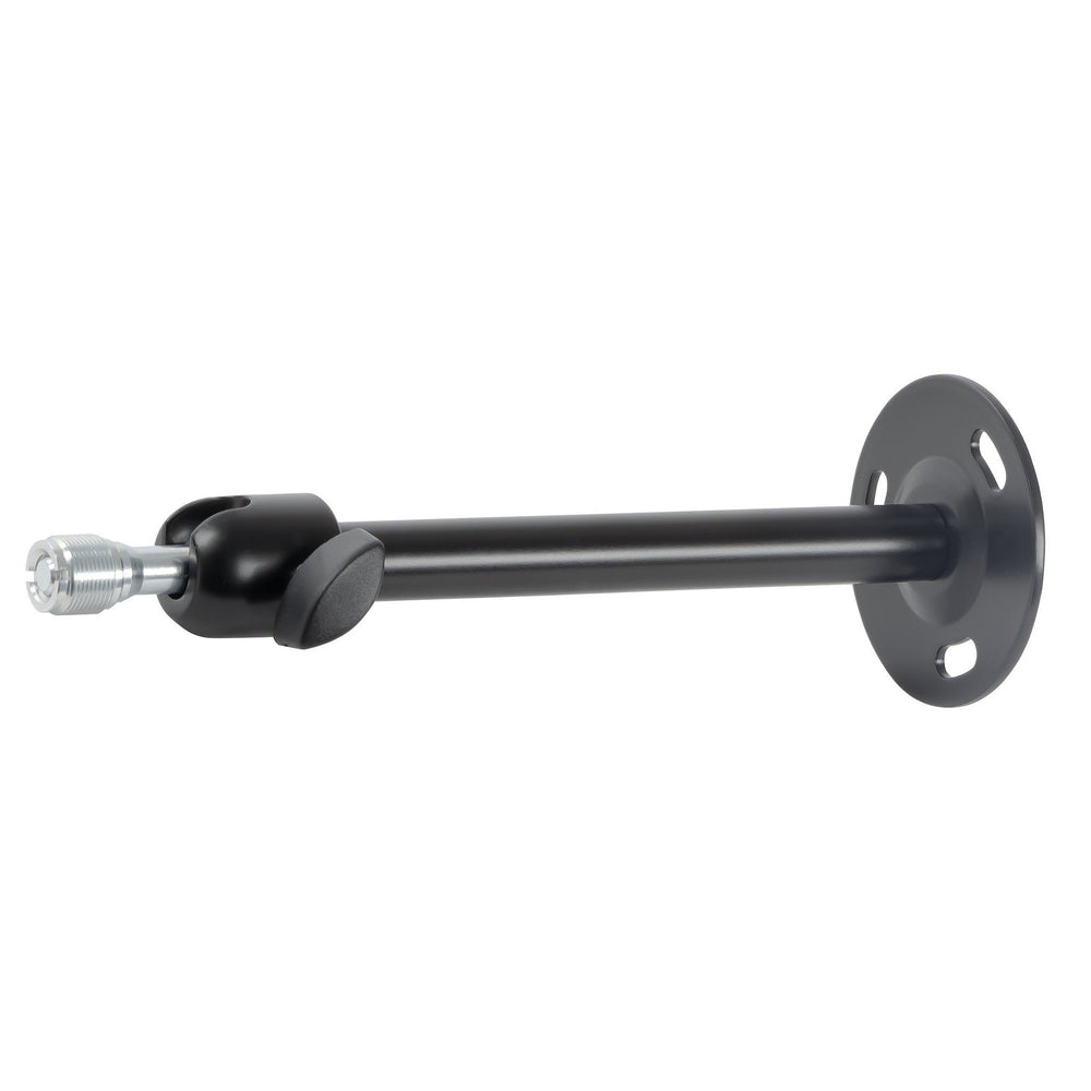 The K&M 24350 Universal Wall Mount is a versatile and reliable solution for securely mounting microphones and antennas in both wall and ceiling applications. Crafted from durable steel with a sleek black finish, this mount is designed to withstand rigorous use while maintaining a professional appearance. Its user-friendly ball joint assembly allows for precise positioning, enabling a full 360° swivel and a tilt range from 0° to 90°. This flexibility ensures optimal placement and orientation of your equipment, enhancing performance and coverage. The mount includes both 3/8" and 5/8" threaded connectors, providing compatibility with a wide range of devices. With a wall clearance of 8.071 inches, it offers ample space for cable management and adjustments. Whether you're setting up in a studio, venue, or broadcast environment, the K&M 24350 delivers dependable support and adaptability.