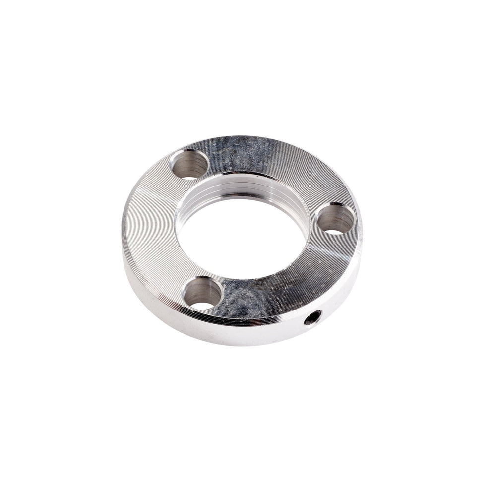 Installation is straightforward and efficient, utilizing a threaded pin and an Allen wrench (hexagon key), both of which are included in the delivery. This ensures that users can quickly and securely attach the adapter without the need for additional tools or accessories. The guy wire ring, crafted from high-quality aluminum, features three drill holes with a diameter of 10 mm each, allowing for the secure connection of rigging lines. This design facilitates stable and adjustable positioning of equipment, catering to the dynamic needs of various stage configurations.