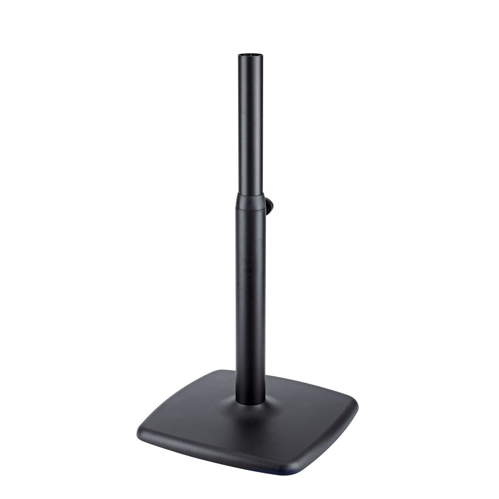 The König & Meyer 26791 Design Monitor Stand is a robust and stylish solution for elevating your monitors to optimal viewing heights. Crafted with a sturdy die-cast base measuring 480 mm x 480 mm (18.898" x 18.898"), this stand ensures exceptional stability and a sleek appearance. The stand's height is adjustable from 644 mm to 1044 mm (25.354" to 41.102") using a spring-loaded clamping knob, allowing for a customizable setup to suit various user preferences. Depending on your monitor's size, up to three different bearing plates (sold separately) can be mounted to provide a secure and tailored fit. Designed for heavy-duty use, the stand can support monitors weighing up to 70 kg (154.324 lbs), making it suitable for a wide range of professional applications.