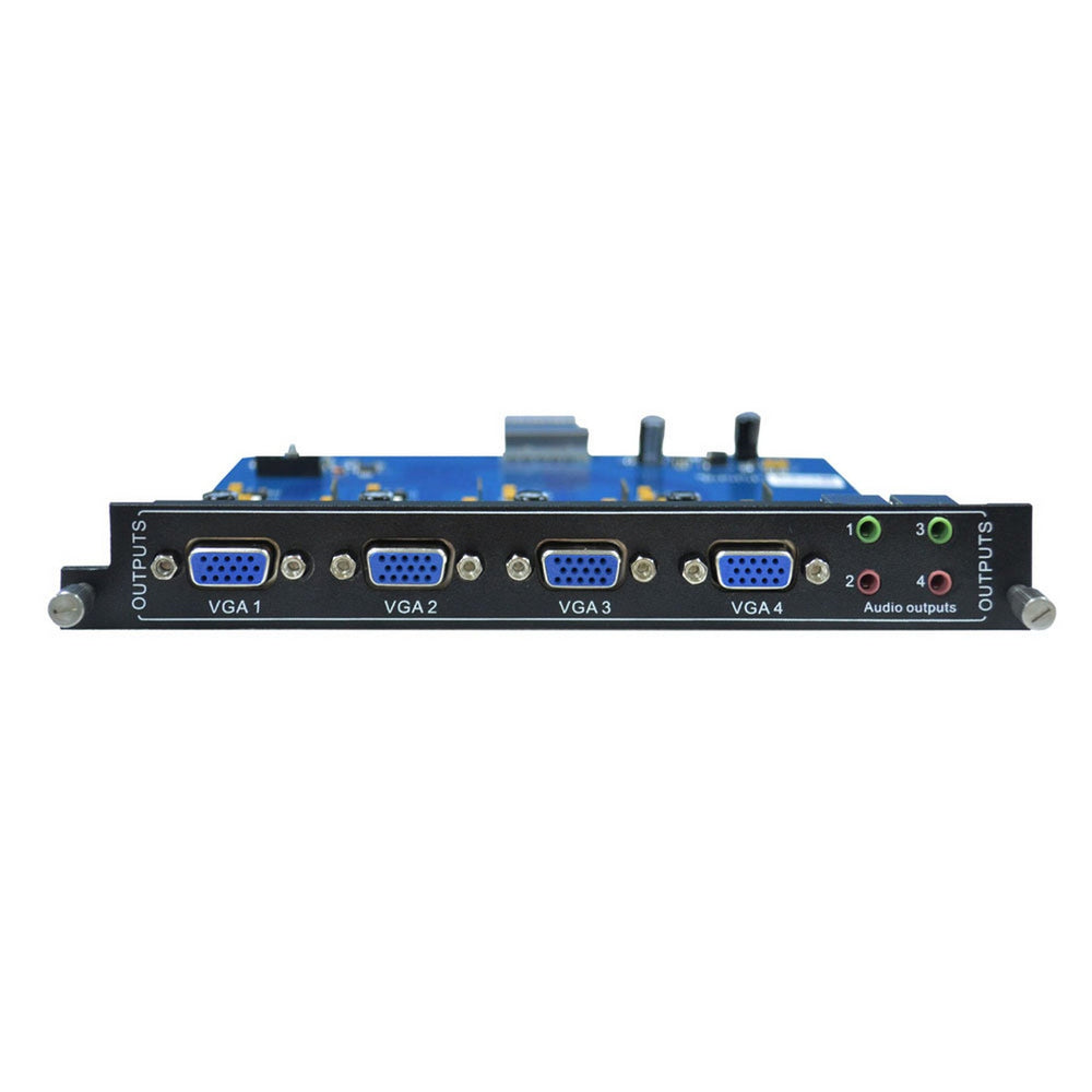 The KanexPro VGA4OCARD is a 4-output VGA module that works with the HDMMX modular matrix switchers. System installers can expand their matrix requirements by adding or removing this card to increase or decrease output channels. It's a high-bandwidth card that supports different analog signal formats including YUV, YC, CVBS and more. The card features a built-in scaler function, which scales the analog input to HD signal output.