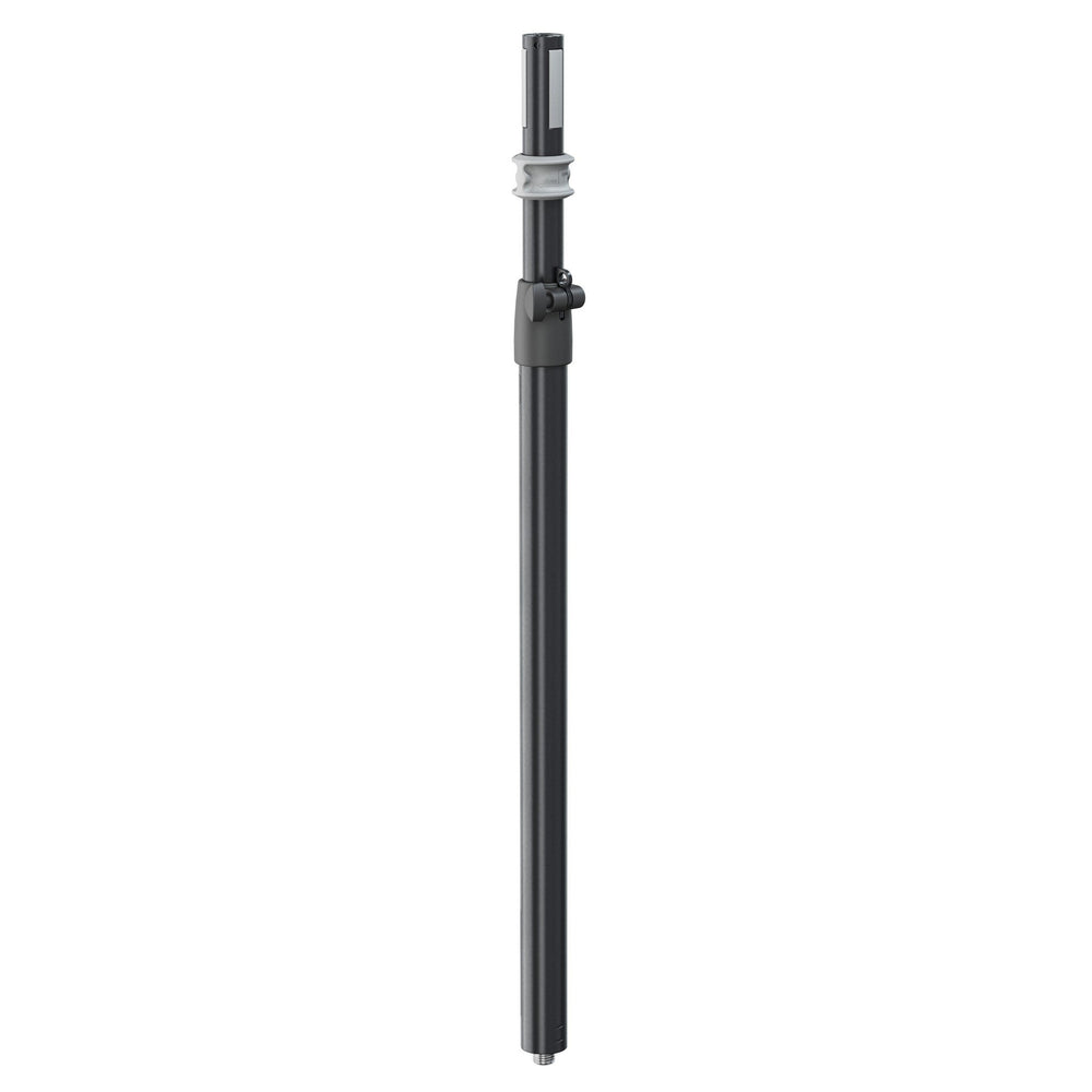Steel tube combination for use in subwoofers with M20 connection. The height is fixed with a safety hook and secured by a clamping screw for a vibration-free and firm fit. The slim design of the clamp allows space-saving transport and ensures a stylish appearance. The usable height is between 900 and 1,400 mm and is adjusted in 5 steps of 100 mm. The patented expanding mandrel with quick-release fastener ensures a tight fit. The plastic expanding splints also ensure a vibration-free connection between the speaker and the tube.