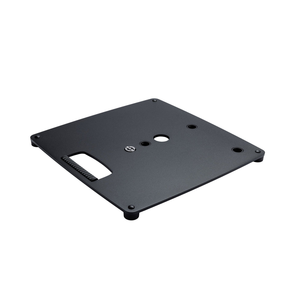 The König & Meyer 26707 Base Plate S is a heavy-duty, solid steel base plate designed for stability and versatility in mounting standard distance rods and rod combinations with M20 threaded bolts. This durable plate features three positioning options: centric, off-center, and corner mounting, providing flexibility for different setup needs. An ergonomic carrying handle ensures easy transport, while integrated cable management helps maintain a clean and organized workspace. The four sturdy rubber feet reduce vibrations, making it ideal for professional audio and stage applications.