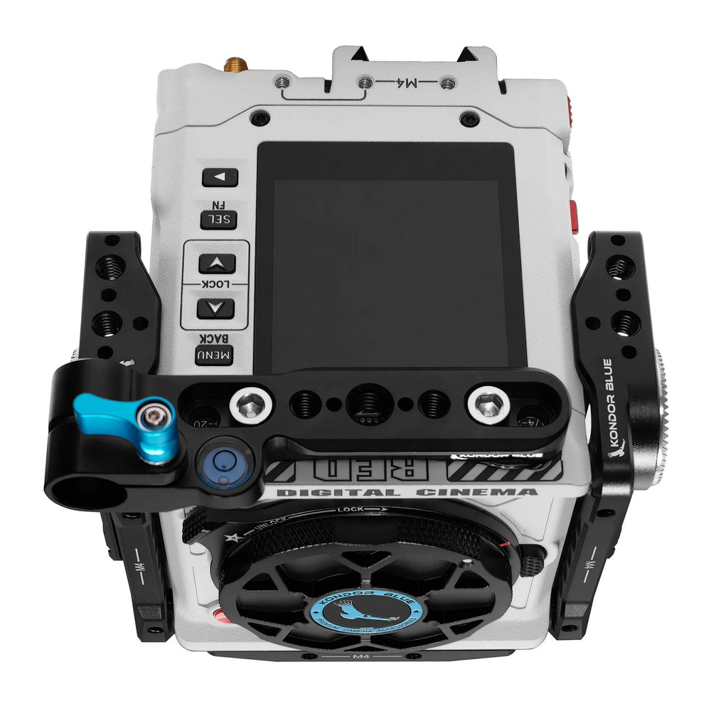 The Left and Right Side Plates include integrated NATO rails, dozens of mounts, and ARRI style rosettes for mounting side handles—such as the KONDOR BLUE Wing Side Handle—or other accessories. These plates are perfect for adding timecode boxes, wireless transmitters, handles, magic arms, and cable management. The fronts feature 4x M4 mounting holes for compatibility with RED’s highly anticipated Electronic ND RF to PL Adapter.