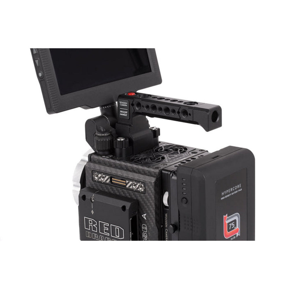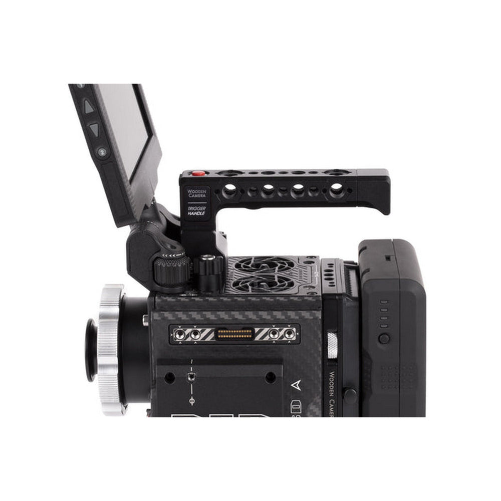 The Wooden Camera Trigger Handle mounts tool-free to the top of RED® DSMC2™ camera brains—including Monstro, Helium, Gemini, Weapon, Epic-W, Scarlet-W, and Raven—via two captured ¼-20 thumbscrews. It enables convenient start/stop control through the camera’s pogo interface and complements the Easy Top and Pass-Through Top Plate systems.