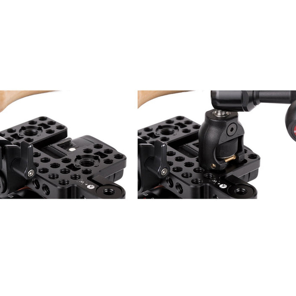 A quick-release, height-adjustable cage for medium-size DSLR and mirrorless cameras (e.g., Canon 5D series, 7D, 6D; Nikon D750/D600/D300). It keeps the camera’s grip and shoe area accessible, adds multiple mounting points, and includes a built-in HDMI clamp. Choose a top handle with a classic wood grip or a rubber grip.