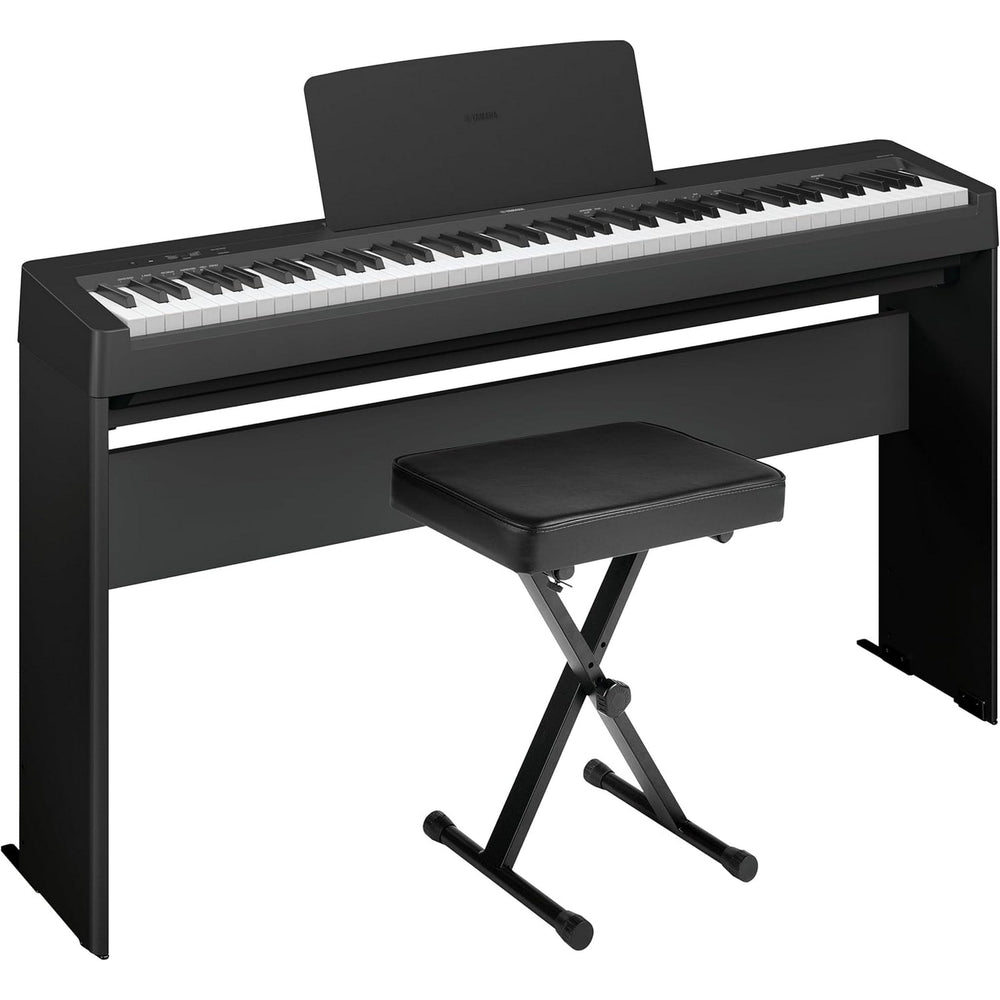 The Yamaha P-143LXB Digital Piano Bundle includes the P-143 portable keyboard along with a stand, bench, sustain pedal, music rest, and AC adapter—providing everything needed to start playing immediately.