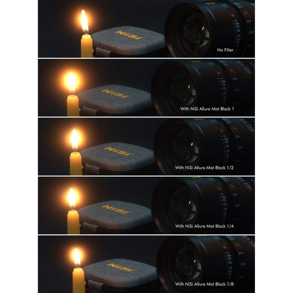 TheNiSi Cinema 4x5.65" Allure Mist Black Filter (1 Stop) reduces highlights and lowers contrast and softens wrinkles and blemishes. Numerous strategies have been developed for softening or diffusing images to create that special "atmosphere" by softening excess sharpness and contrast.