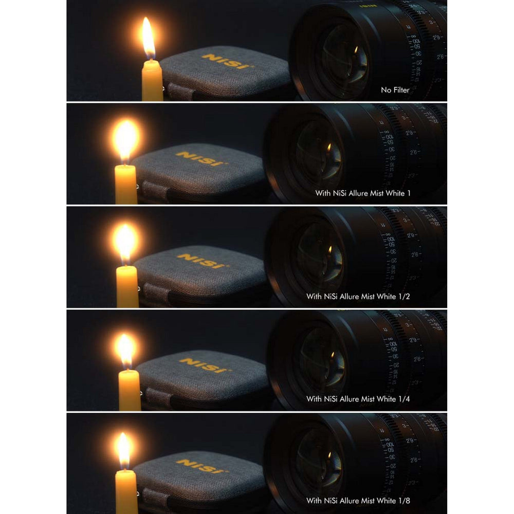 TheNiSi Cinema 4x5.65" Allure Mist White Filter (1/8 Stop) produces mist effect and reduces overall flare & contrast. Numerous strategies have been developed for softening or diffusing images to create that special "atmosphere" by softening excess sharpness and contrast. Lighter strengths of Allure Mist can be used to soften modern cameras and lenses.