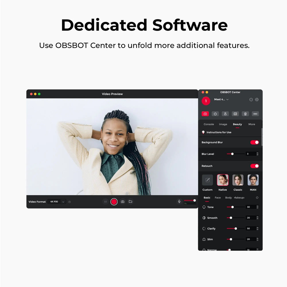 Thanks to the integrated AI chip, the OBSBOT Meet 4K can blur your background with just the click of a button. No extra apps are required and most webcam software is compatible.