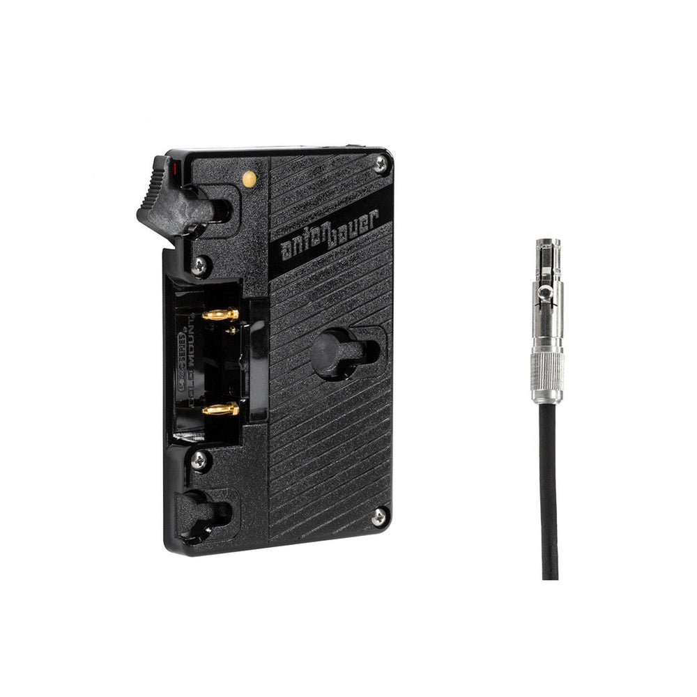 Wooden Camera brand Gold Mount plate utilizing an Anton Bauer Mount and genuine Odyssey 7Q power connector. Cable exits the right side of the plate allowing neat looping and insertion into the monitor/recorder. Length allows minimal cable excess while still being able to reach positions further away from the monitor as necessary.