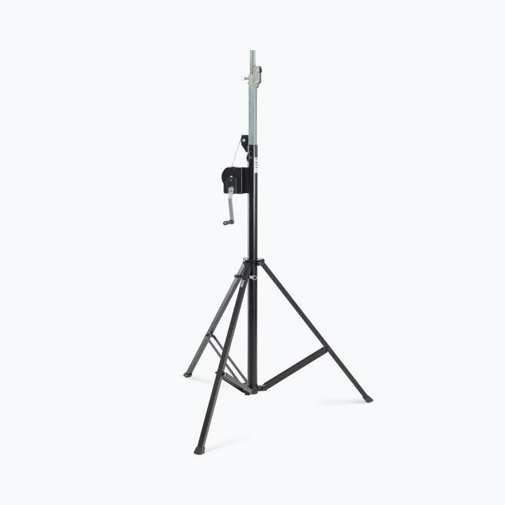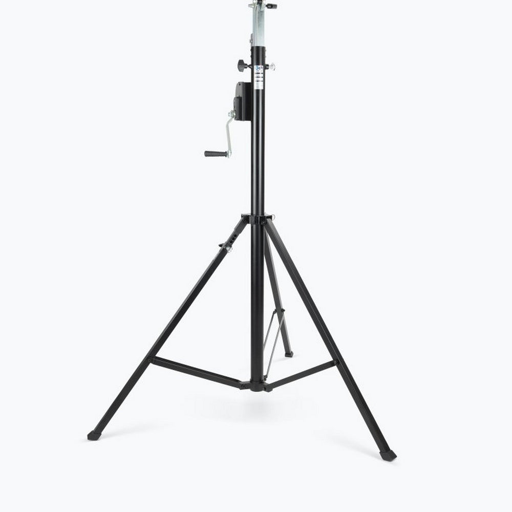 The On-Stage LS9900B Crank-Up Lighting Stand is a robust and portable solution designed for professional lighting and speaker setups. Ideal for theaters, outdoor venues, and performance spaces, this stand offers a height adjustability range from 74" to 157.5", allowing for versatile configurations. The hand-cranked ratcheting winch system ensures safe and effortless raising and lowering of mounted equipment, making setup and teardown processes efficient and ergonomic.