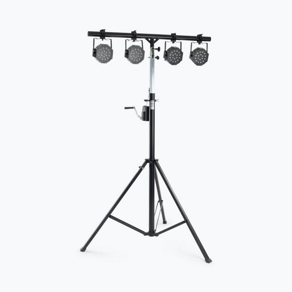 Constructed from durable steel, the LS9900B features a braced tripod base with lengthy legs and non-slip rubber feet, providing outstanding stability and load balance. The detachable T-bar at the top of the shaft accommodates up to four lighting fixtures, including PAR cans, LEDs, spots, lasers, projectors, and moving heads, with a maximum load capacity of 185 lbs. For ease of transportation and storage, the stand folds down compactly, and the T-bar can be detached.