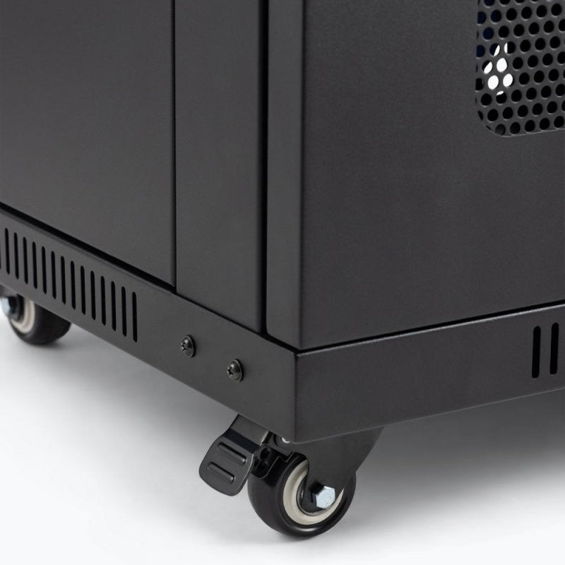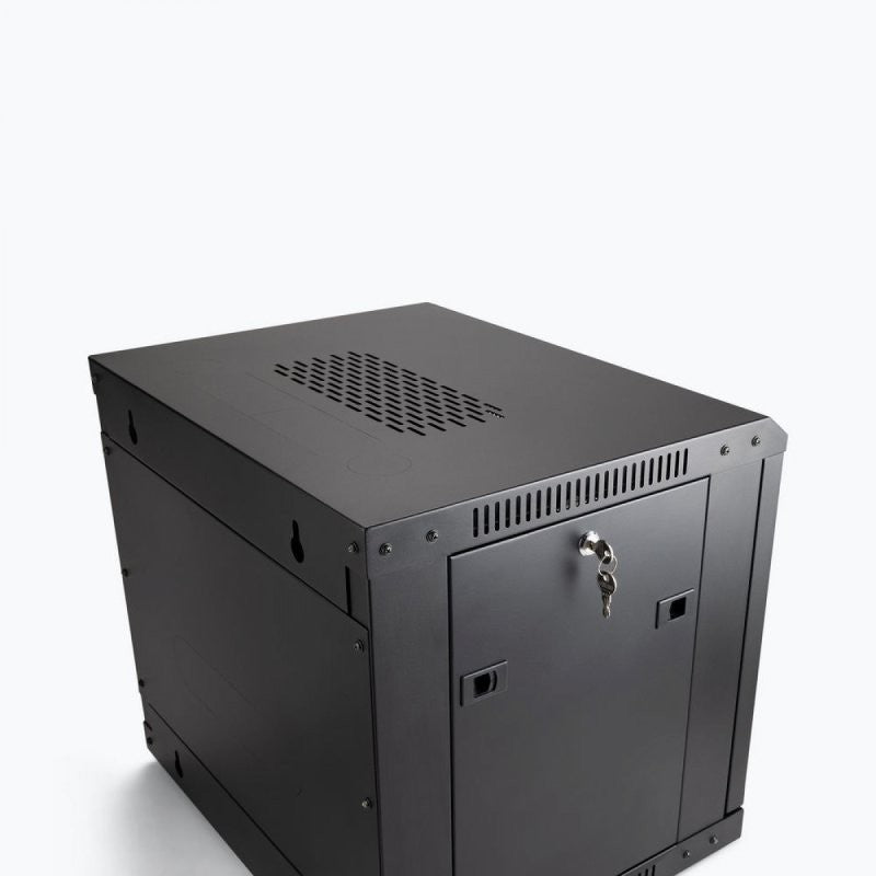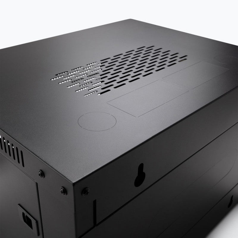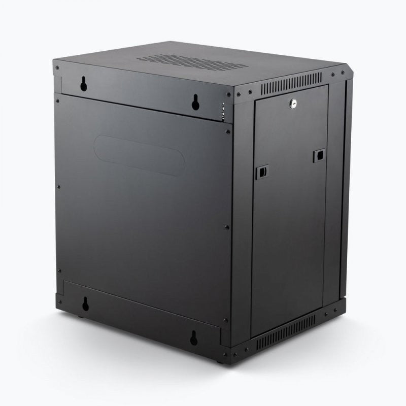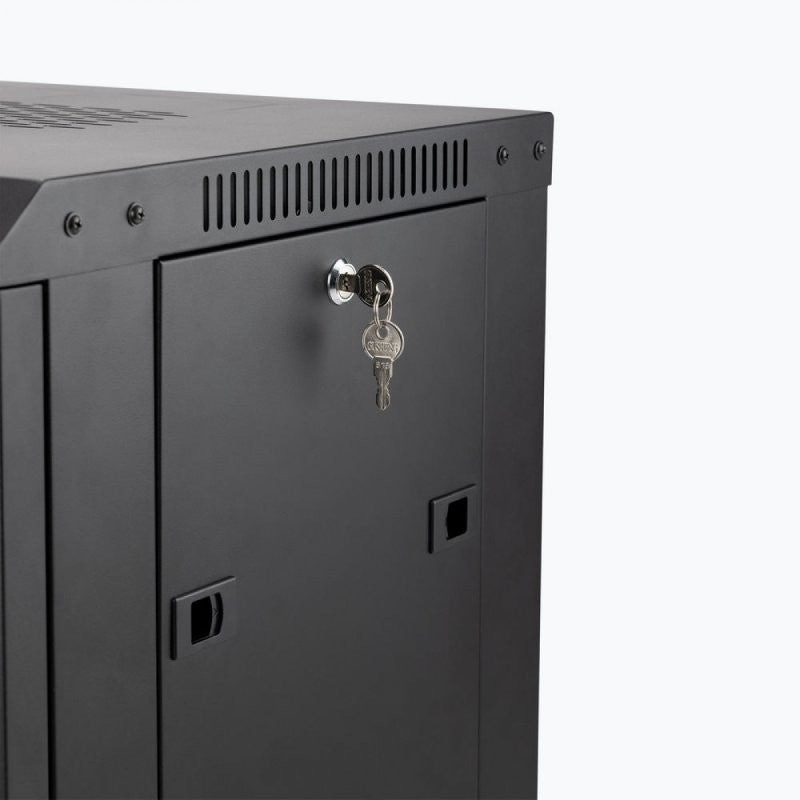 The Wall-Mount Knock-Down Rack is the perfect solution for protecting and organizing your rack-mount components. This sturdy rack features built-in rails that accept standard #10-32 rack screws, providing ample space to house your 19-inch audio rack gear. The enclosed cabinet design not only keeps your equipment safe from dust and debris, but also deters unwanted access. To further ensure the well-being of your devices, eight strategically placed vents promote proper airflow, preventing overheating. The rack boasts a lockable front door and two lockable, removable side panels, offering you easy access to the front and rear of your equipment for cable management and configuration adjustments. The side panels utilize spring-loaded releases for a secure fit, with the option to lock them for enhanced security. The rear panel is removable using four screws, simplifying the setup and installation process. Perforated knockouts on the top and rear panels provide the flexibility to create custom openings for your specific cable and antenna requirements. These knockouts remain closed for maximum enclosure if left intact. Keyhole hangers on the rear panel allow for stable wall mounting, making this rack ideal for conference rooms, recording studios, and commercial sound installations. The rack also includes optional feet for desk or shelf placement. For increased mobility, casters can be purchased separately. When using casters, lock them to ensure the rack stays securely in place during storage, presentations, performances, or recording sessions. The rack's steel construction guarantees robust support for your equipment, while the classic black finish offers a professional aesthetic that complements any conference room, livestream setup, stage, or studio environment. When not in use, the frame conveniently disassembles for space-saving storage and efficient transportation.