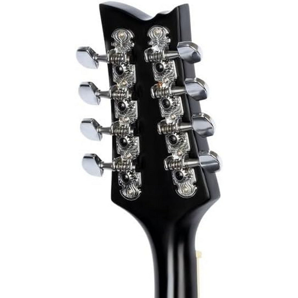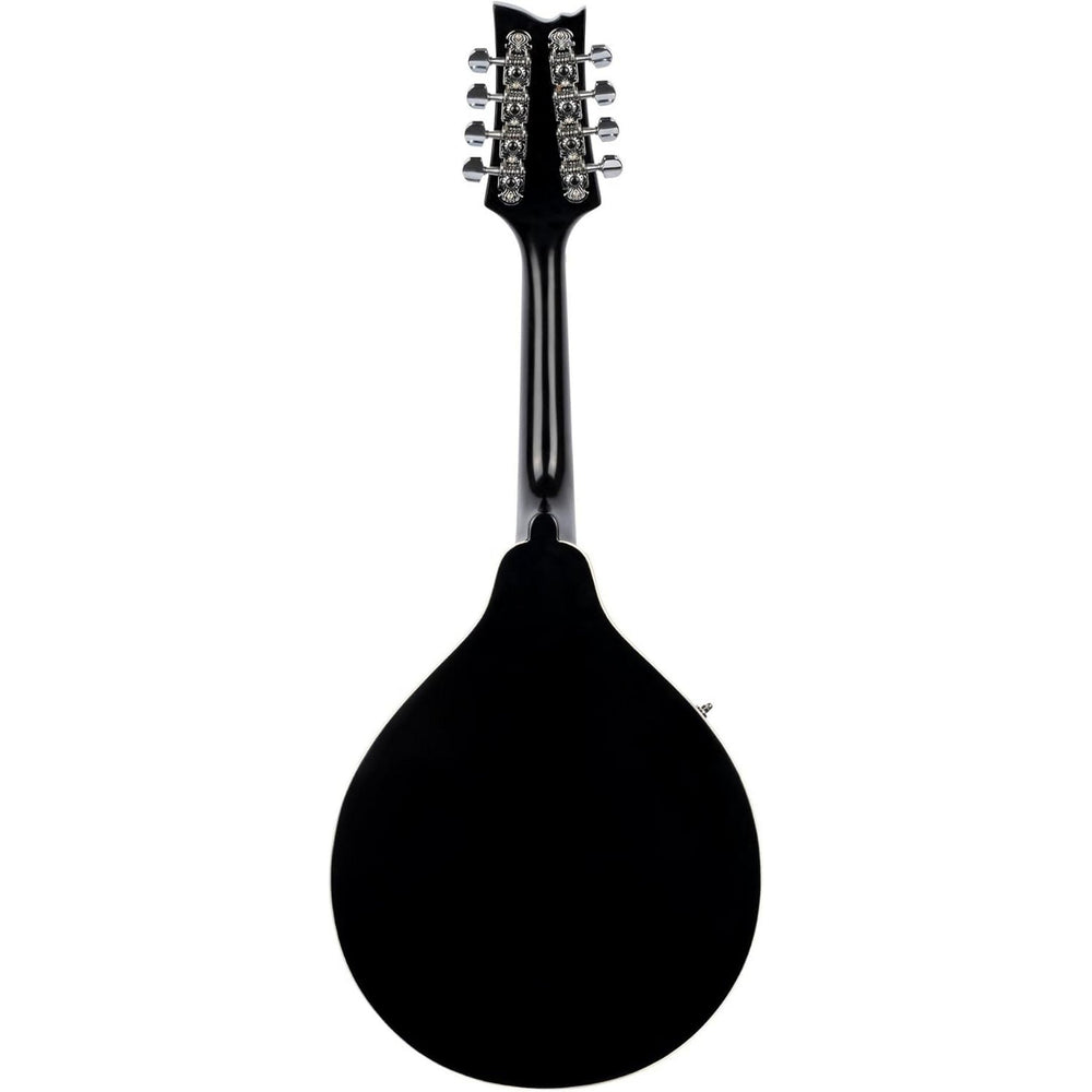 The mandolin features a spruce top with maple back and sides finished in satin black. An arched maple back and F-hole sound openings support traditional mandolin design characteristics. Integrated bridge-mounted piezo electronics provide passive tone and volume control.