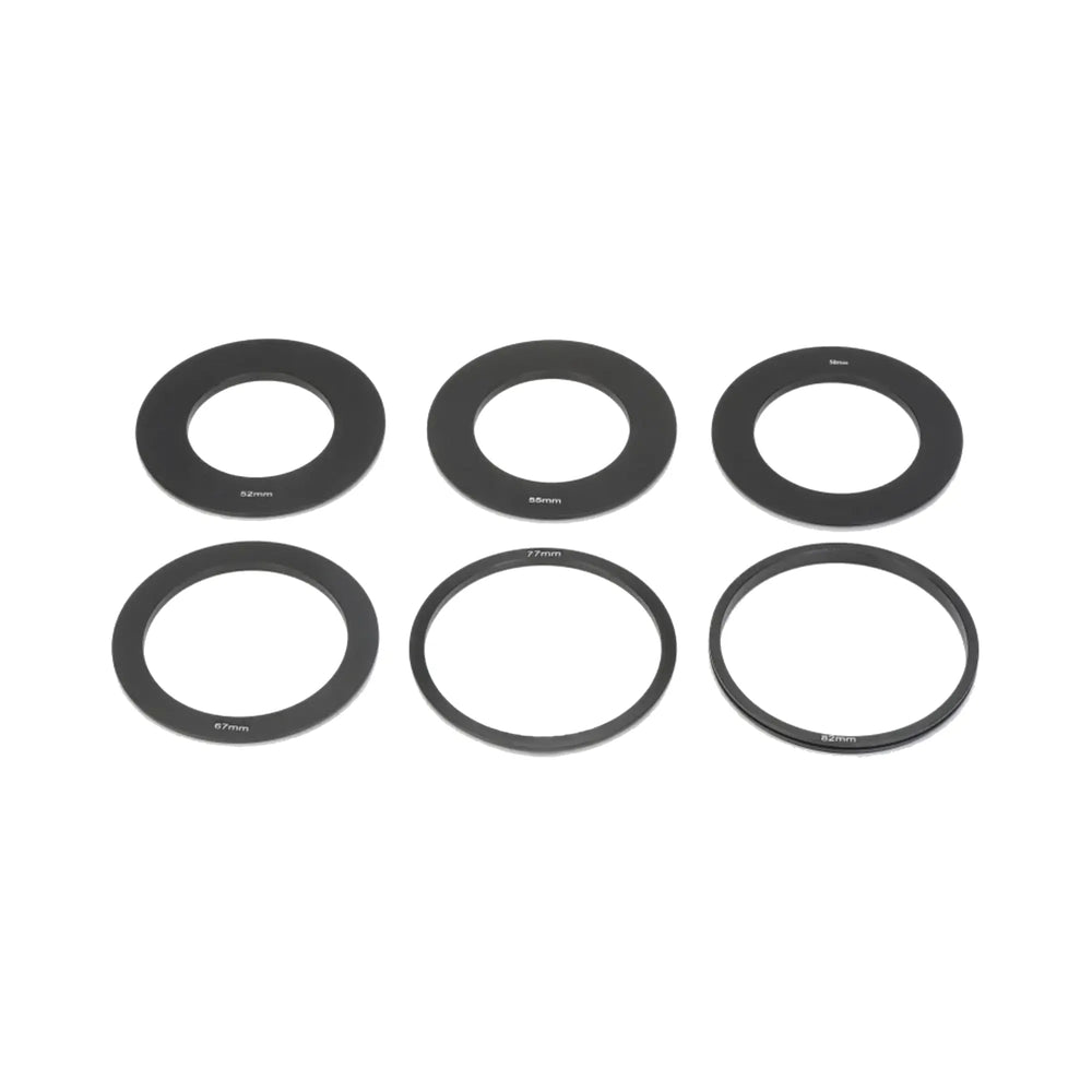 The kit includes direct lens mounting rings for 52mm, 55mm, 58mm, 67mm, 77mm, and 82mm filter threads; other sizes can typically be used with step‑up or step‑down rings sold separately.