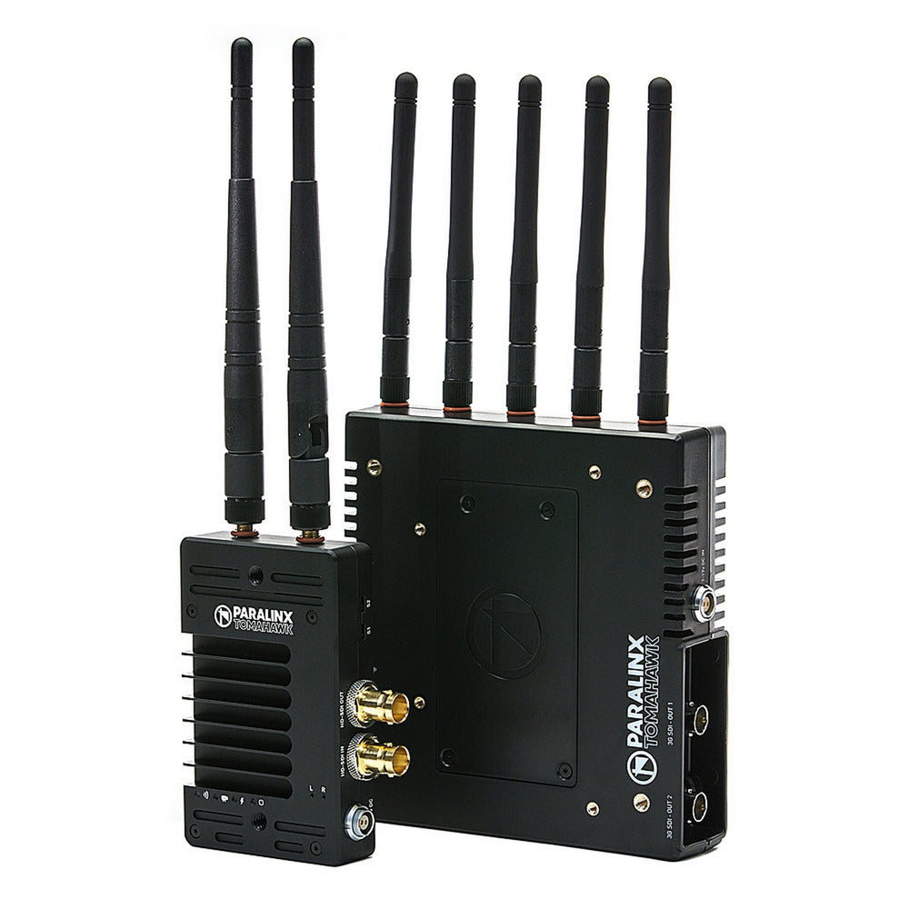 The Paralinx TOMAHAWK is a revolutionary HD Video Transmitter system offering Real Time Wireless HD with unprecedented range for your Television, Film, Broadcast, Industrial or UAV/UAS application. The Paralinx Tomahawk has a range of up to 2000 feet (600m) with default antennas (longer range possible with optional antennas) and still maintains an incredible sub 1ms latency glass-to-glass. Both the Transmitter and Receiver feature 2-Pin Lemo power connectors capable of a wide 7-17V unregulated input voltage. The Tomahawk SDI system features 3G-SDI input (with loop-out) on the transmitter and dual 3G-SDI outputs on the receiver.