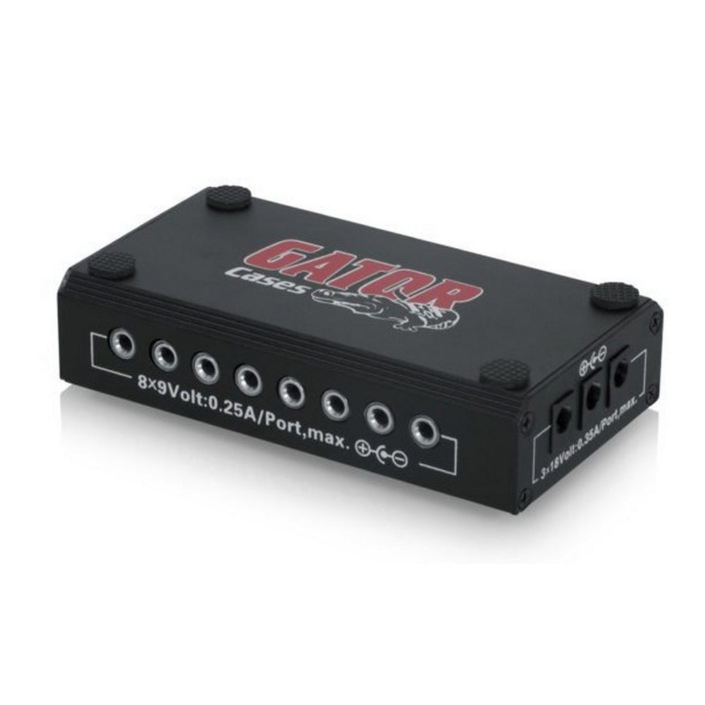 Keep pedals powered safely and neatly with the multi-output DC source G-BUS-8-US pedal board power supply with short circuit protection. This 1700 milliamp unit features heavy-duty aluminum housing and enough juice to fuel up to 11 standard size stomp boxes. Pick your power through a variety of 9V and 18v multi-output options. Connect your stomp boxes securely with one 18v 24 and eight 9V 24 straight end cables. Four mounting holes can be used with any Gator or other brand pedal boards. Guitar effects pedals are fully powered with the G-BUS-8-US pedal board power supply from Gator Cases.