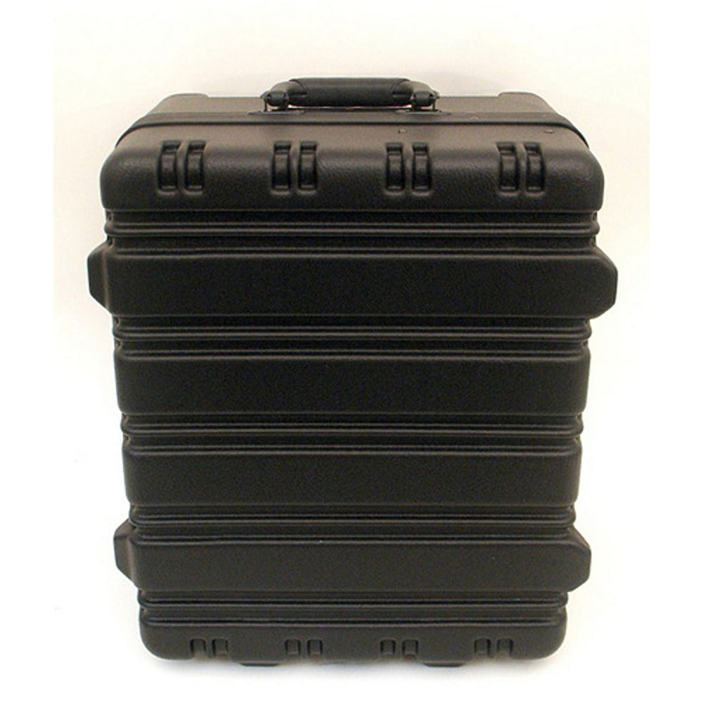 High-tech rugged ribbed case in a large size. Black valance with all black hardware, built-in TSA accepted combination lock, 2 recessed military-style latches, cardholder, exterior mesh accessory pouch, full-length piano hinge, stitched vinyl steel-core handle, ball-bearing wheels and telescoping handle. 1 top handle and 1 side handle added for easier handling. New compartments have been added to the bottom of the case to increase storage capabilities. Comes standard with Platt's SG and SH super-sized pallets. Accepts all super-sized pallets.