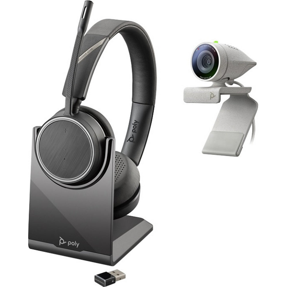 The Poly Studio P5 Kit with Voyager 4220 UC includes a professional webcam and wireless headset with crisp stereo audio and noise cancelling dual headset mics.