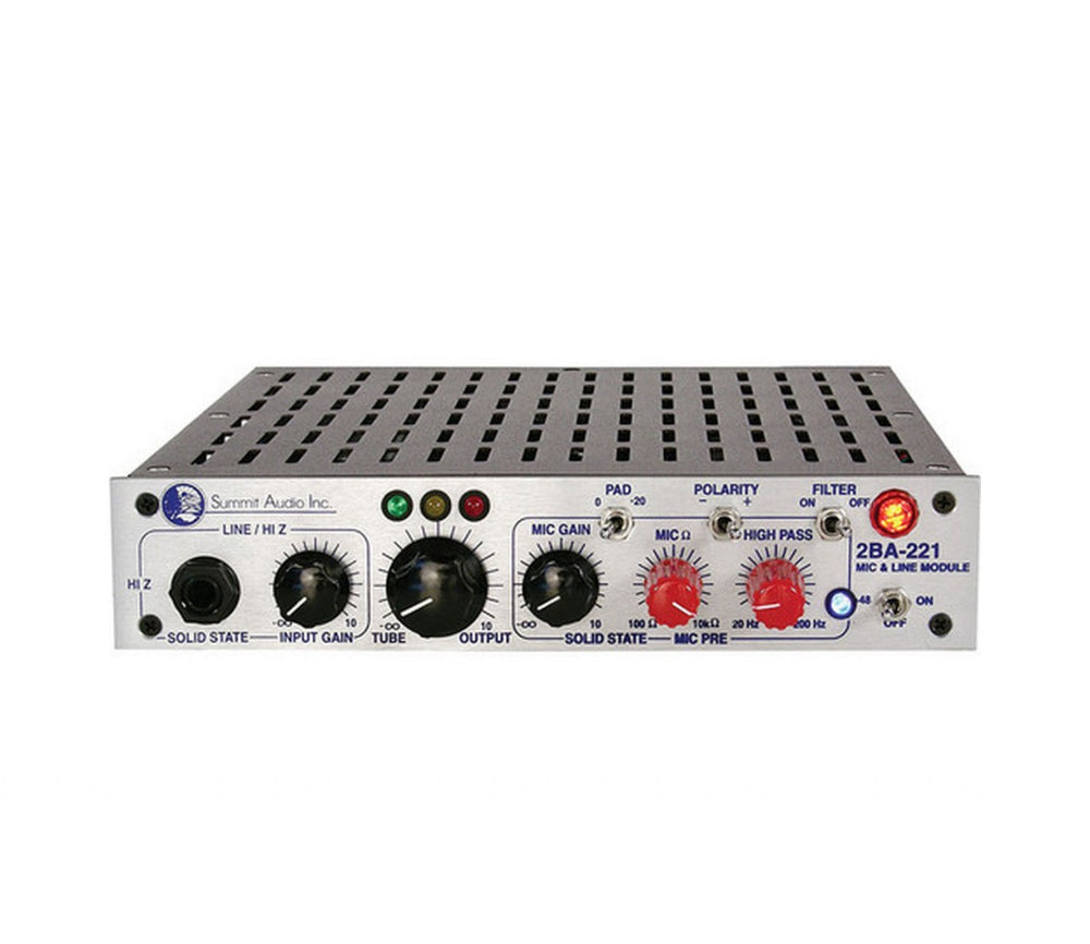 The Summit Audio 2BA-221 Microphone and Line Preamplifier is a microphone/line preamplifier featuring continuously variable microphone impedance. The preamp utilizes separate and individually controlled solid state input controls to mix a microphone input with a Hi-Z or line input into a variable vacuum tube output. Using both the variable impedance and variable solid state and tube stages provides a high level of sonic control. It is is made with the highest quality full-voltage tube and solid-state signal paths and the best components available. The 2BA-221 even has a separate, dedicated power source for its 48V phantom power, and does not draw current away from the main circuits.