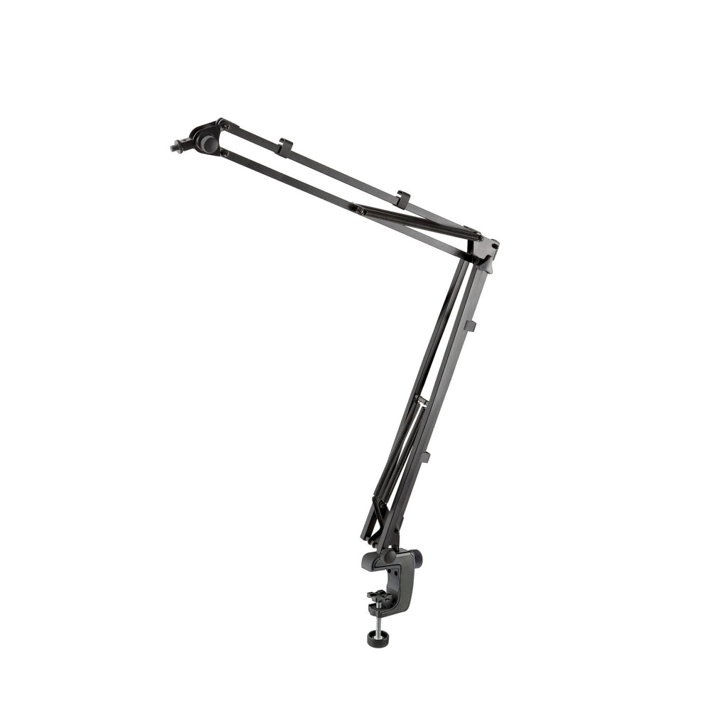 Flexible desktop microphone boom arm with 3/8" or 5/8" threaded connection for recording studios and multimedia workstations. Microphones, tablets or smartphones with a total weight of up to 0.8 kg can be easily and conveniently aligned and positioned. The microphone desk arm is supplied without cable and can therefore be equipped individually. Four useful cable clips are already included in the scope of delivery. With a clamping range from 20 to 51 mm, the clamp offers a wide range of mounting options. The sturdy metal frame with high-quality plastic inserts and non-slip support ensures secure and powerful clamping. Thanks to the specially shaped clamping surfaces, the clamp can be used on smooth surfaces as well as on round tubes. Optionally, the microphone boom arm can also be fixed with the additionally available table flange 23855.