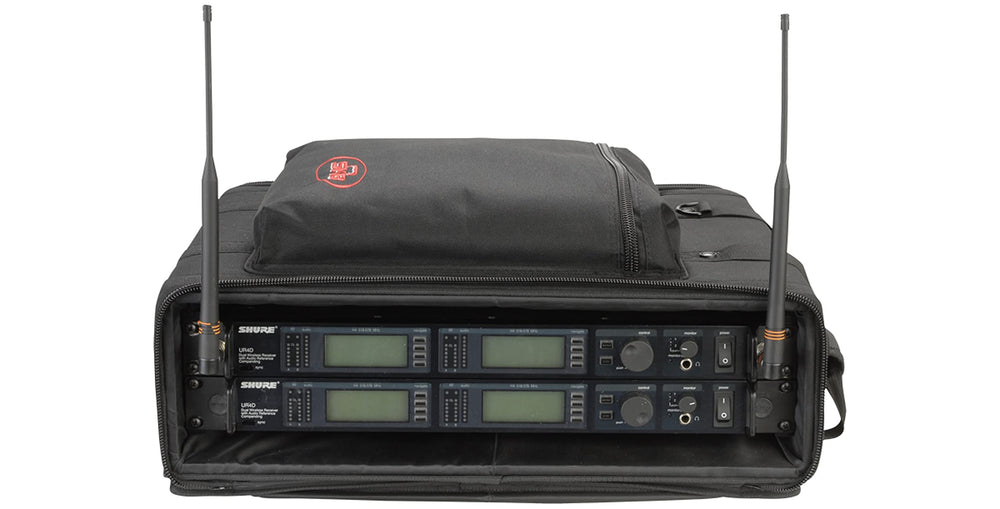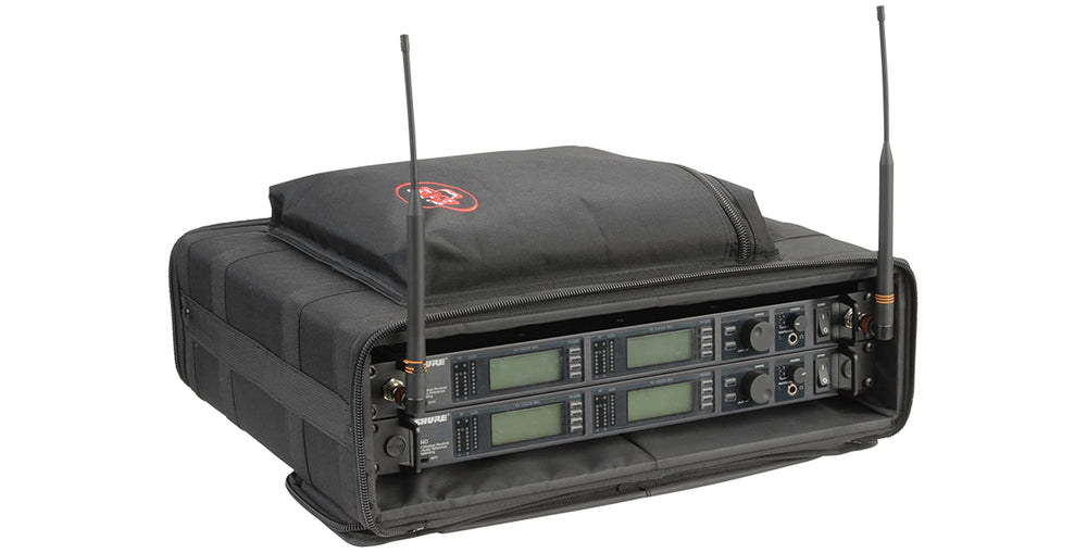 The 14.5 inch depth (front rail to back flap) provides plenty of room for the most popular wireless systems. The padded front and back lid has heavy duty zippers that allow for the flaps to open fully and fold underneath. A zippered pouch on the inside front flap provides excellent storage of wireless mic antennae. An ample sized exterior zippered pouch is ideal for cables and/or body packs. Threaded steel rack rails are recessed to provide protection for equipment controls without inhibiting proper antennae placement. These cases are covered by SKB’s one year Soft Product warranty.