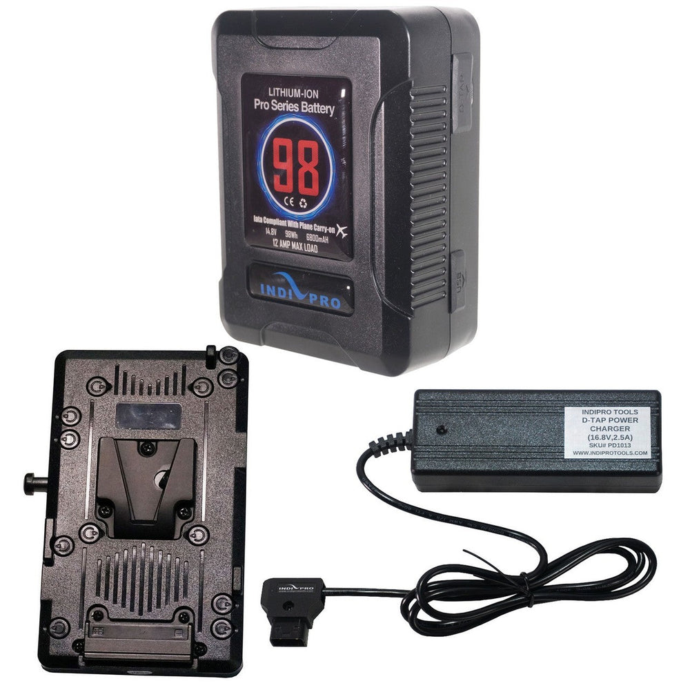 The IndiPRO MSBMUKT Micro-Series V-Mount 98Wh Blackmagic URSA Kit is the ultimate power solution for your Blackmagic URSA camera setups. This comprehensive kit includes a high-capacity Micro-Series 98Wh Lithium-Ion V-Mount battery, a robust D-Tap Pro Battery Charger, and a V-Mount Adapter Plate specially designed for Blackmagic URSA and URSA Mini cameras. This kit ensures that your camera remains powered for extended shooting sessions, eliminating the need for frequent battery swaps and allowing you to focus on capturing stunning footage.