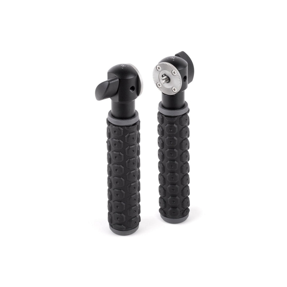 A pair of handles with ARRI style, 60 tooth rosette and M6 thumbscrew. Attaches to Rosette Arm, Universal ARRI Rosette Rod Bracket, Crossbar v2, Crossbar v3, or existing ARRI equipment. Available in Rubber or Brown Leather.
