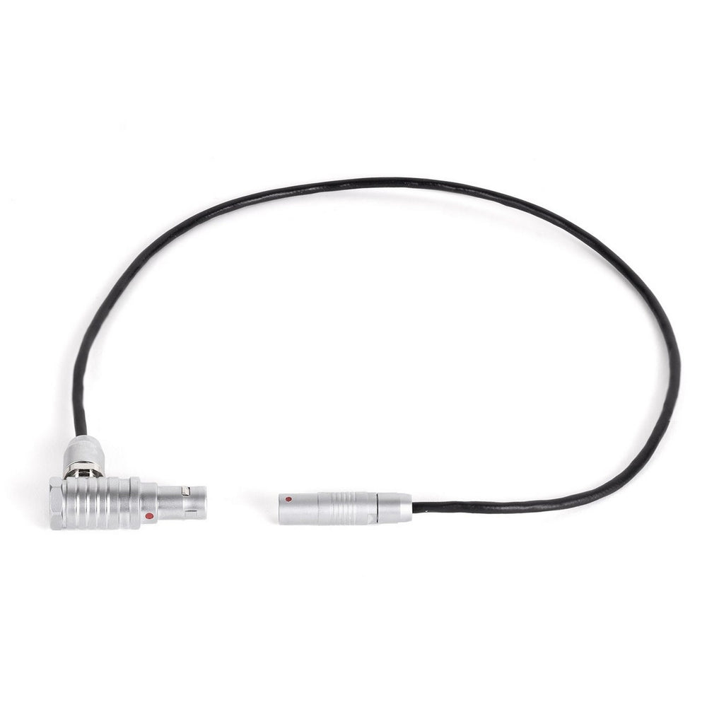 RED KOMODO CTRL Control Cable is a Female 4pin 00 LEMO compatible connector to a right angle, RED EXT, 9pin LEMO. The connector exits toward the operator side, leaving other ports or accessories on the back of the camera accessible.