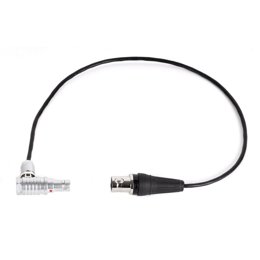 RED KOMODO Genlock cable is a female BNC connector to a right angle, RED EXT, 9pin LEMO. The connector exits toward the operator side, leaving other ports or accessories on the back of the camera accessible.