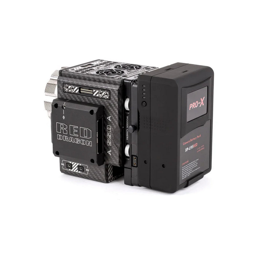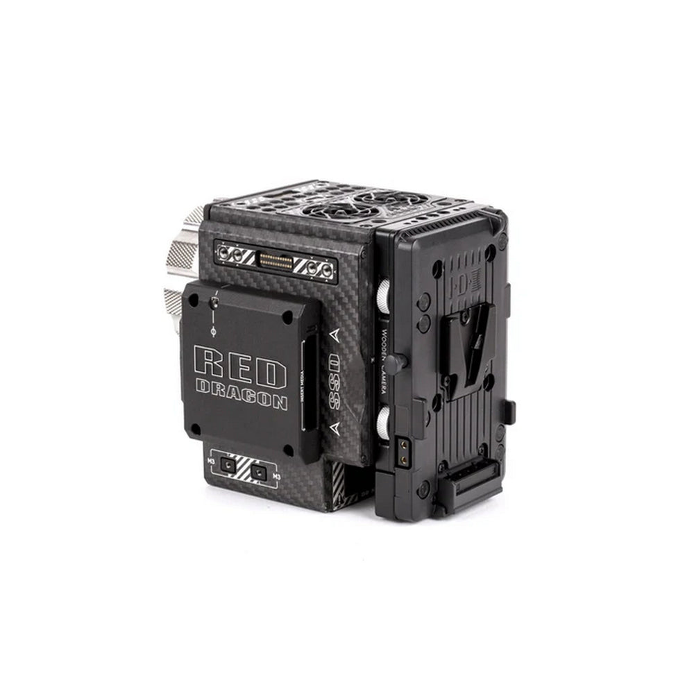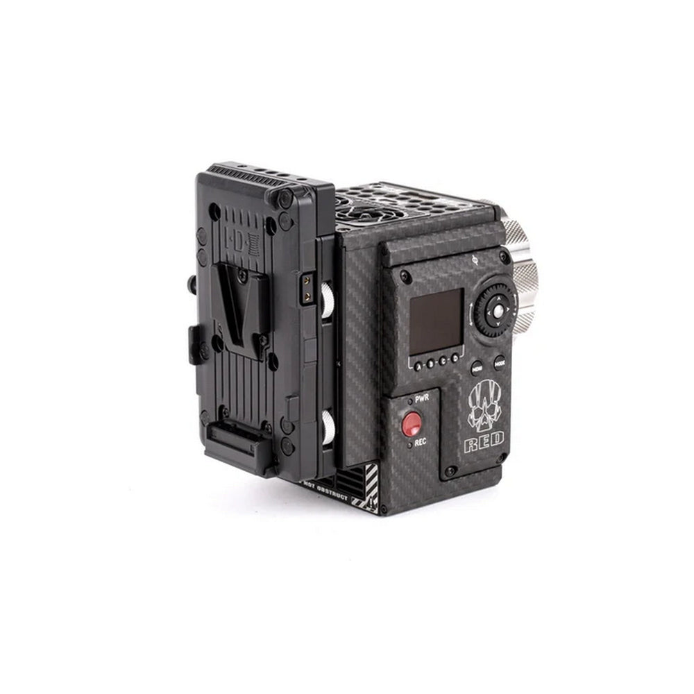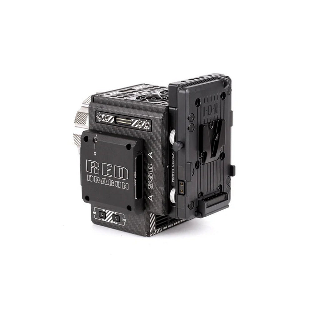 The Wooden Camera Cable-less V-Mount is a V-Mount battery plate designed specifically for RED® DSMC2™ cameras, including Monstro, Helium, Gemini, Weapon, Epic-W, Scarlet-W, and Raven. It attaches tool-lessly to the rear of the camera or compatible modules, offering a clean, cable-free power solution.