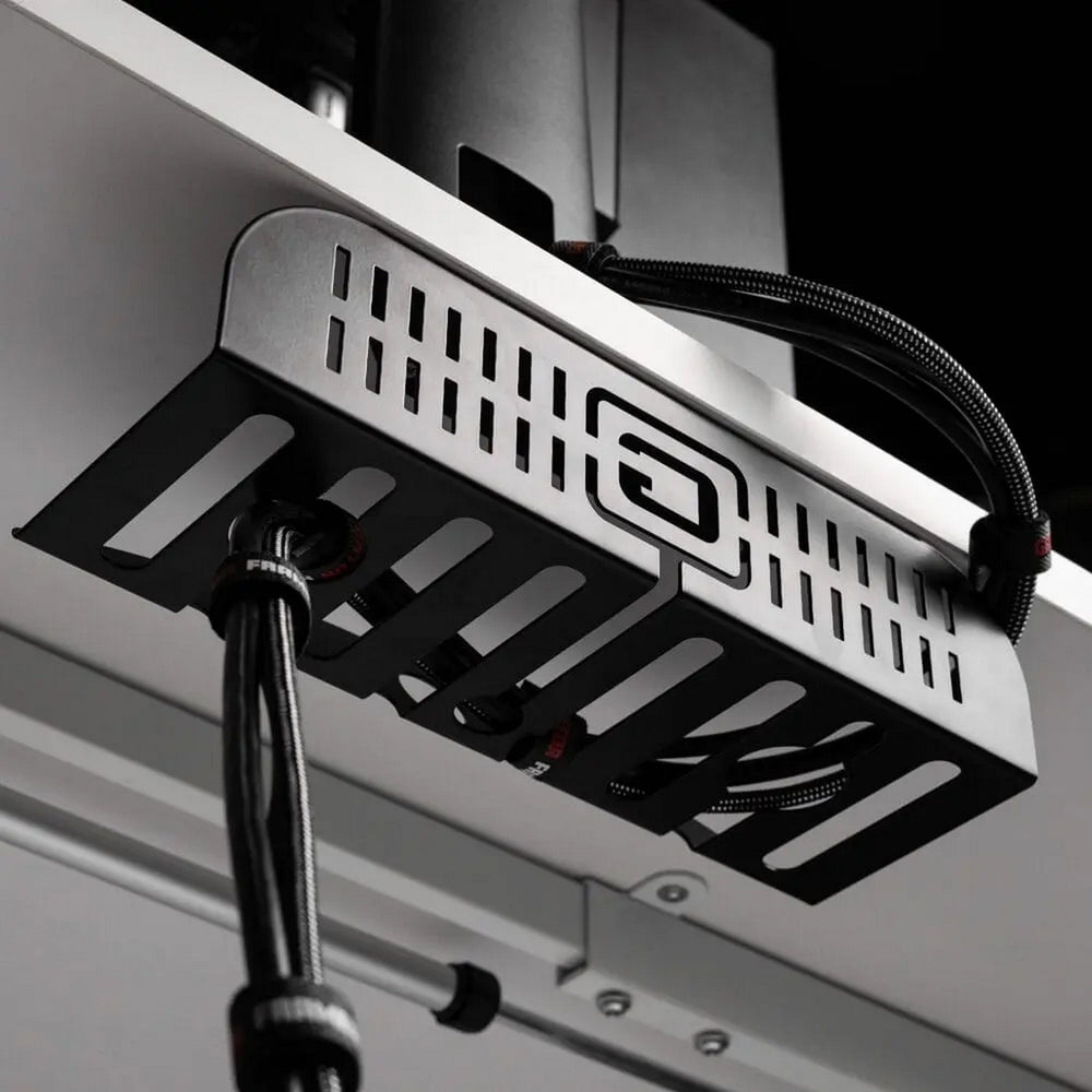 The system mounts beneath a desk surface to keep cables off the floor and contained in a dedicated tray. Precision-cut pass-through slots support routing of multiple connector types while maintaining organized separation. The steel construction supports repeated use in home, studio, and office environments.