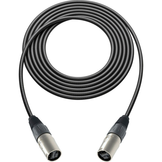 The cable is constructed using Belden 7923A paired CAT5e DataTuff twisted-pair cabling with a UV-resistant PVC jacket. It terminates with Neutrik etherCON NE8MX-1 connectors that protect standard RJ45 interfaces during deployment. The design supports repeated connection cycles in demanding environments.