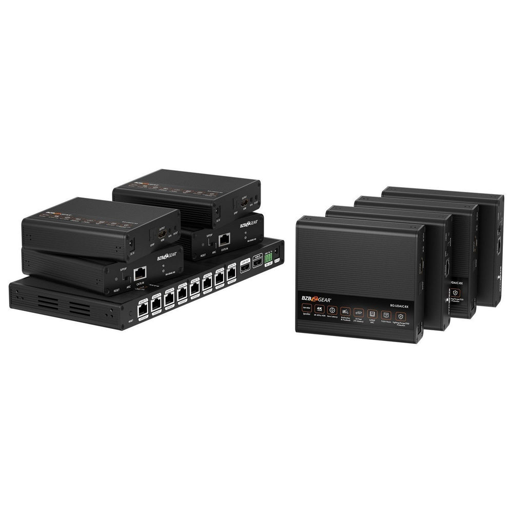 The BG-UDAIC-E18 is an HDMI extender and splitter kit that distributes one HDMI input to up to eight extender outputs. The signal can be extended at ranges of up to 70 meters (230 feet) with category cabling. Connectivity & Quality This HDMI extender and splitter kIt'supports resolutions up to 4K@60Hz. With the BG-UDAIC-E18, transmission of video signals is done with zero latency. The transmitter in this kIt'supports HDMI loop out for operators to utilize when necessary. Each receiver can output the digital audio of the TV (ARC) or from the source device via the S/PDIF port. Control With bi-directional IR passthrough via IR blaster and IR receivers, operators have a greater degree of control over connected displays from one location regardless of distance and obstacles. EDID passthrough can be used with the BG-UDAIC-E18. The EDID of the kit can also be manually set via EDID DIP switches when extra adjustment is needed. RS-232 passthrough is also supported.