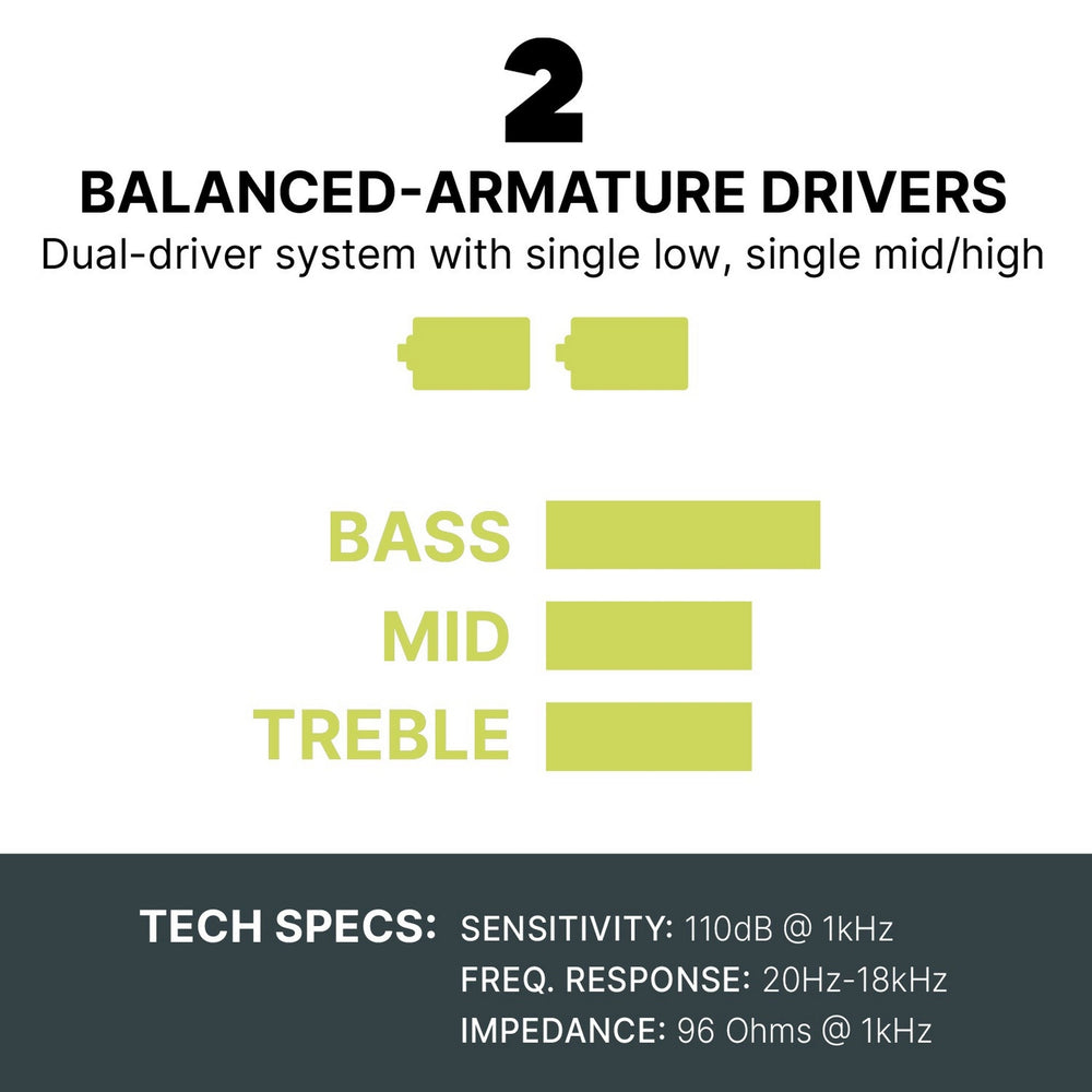 - Dual Balanced-Armature Drivers: Dedicated drivers for low and mid/high frequencies