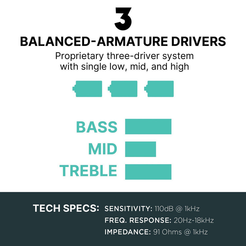 - Driver Configuration: 3 balanced-armature drivers (single low, mid, and high)