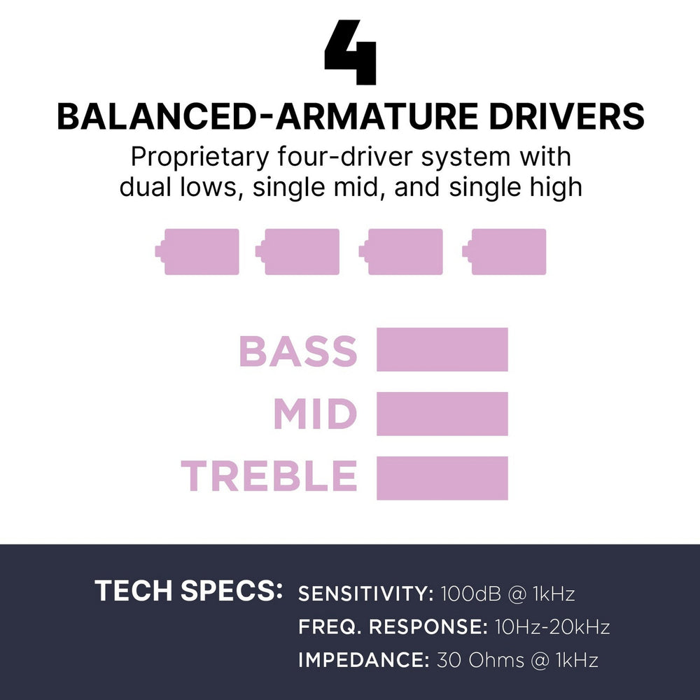 - Driver Configuration: 4 balanced-armature drivers (dual low, single mid, single high)
